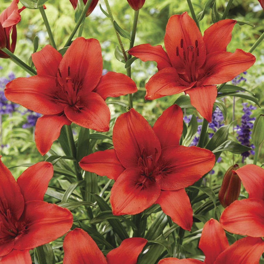 Plant Red Highland Asiatic lily bulbs before the first frost in fall, and in spring to early summer they bloom in huge, fiery red star-like flowers. The Asiatic lilies are reliable bloomers with an extended season of blooms, with flowers having large, pollen-covered anthers that attract bees and butterflies to the garden. But these gorgeous blooms also make excellent cut flowers for bouquets and stunning additions to floral arrangements. When cutting flowers, leave as much stem and foliage in place as possible, leaving at least 2/3 of the stem with leaves to renew the bulb for next year's growth and flowering.