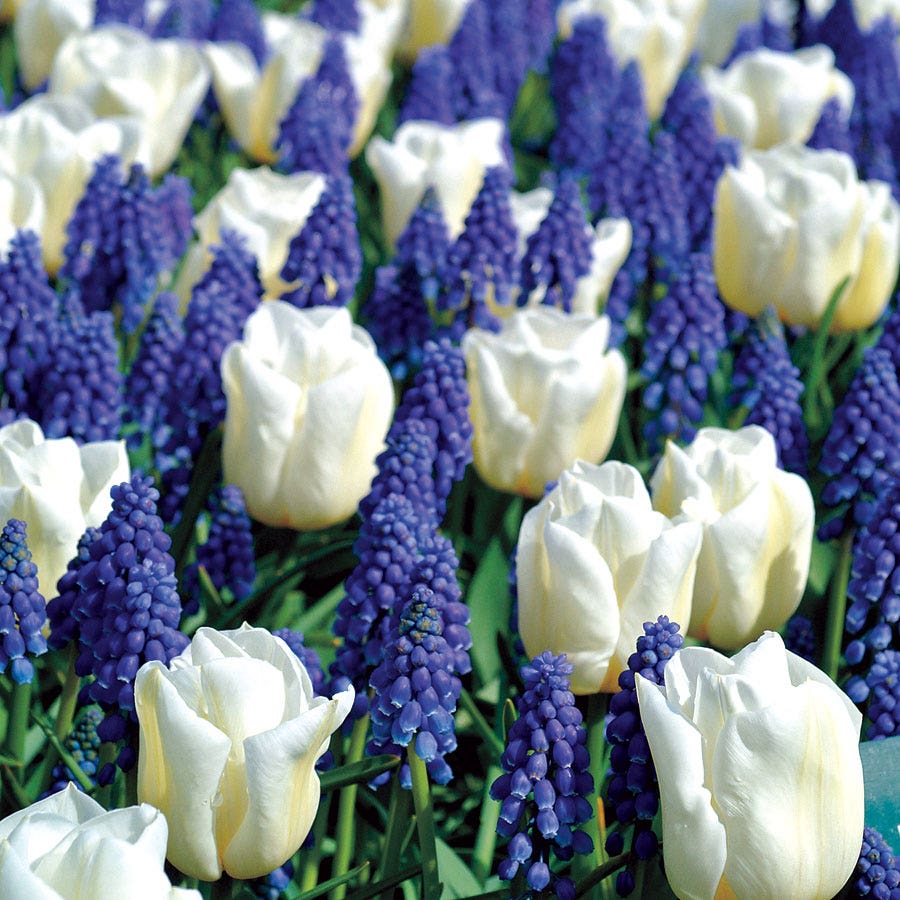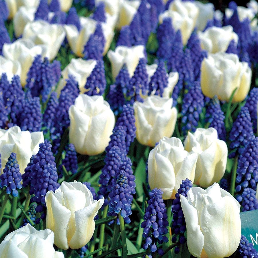 Who says planting a gorgeous garden has to be a hassle? This terrific Tulip Muscari Mix brings you rich floral presence with virtually no effort! When planted together, the azure blue Grape Hyacinth and the fragrant cloud white tulips create a contrast that is simply phenomenal. Sharing the same size and bloom time, the true beauty of these spring flowers lies in the contrast in color and texture. None of your garden guests will be able to look away from the harmony created by these two majestic spring icons. This blend blooms in the peak of spring in full sun to dappled shade. Both varieties are long-lived and very weather-tough, ready to withstand the rains, winds, and heat of spring. Even cold snaps won't dim their display as both varieties are quite cold hardy. Both plants like to multiply and spread so give them plenty of space to fan out and increase the beauty of your garden year after year. Pack of 10 (6 Muscari, 4 Tulips).