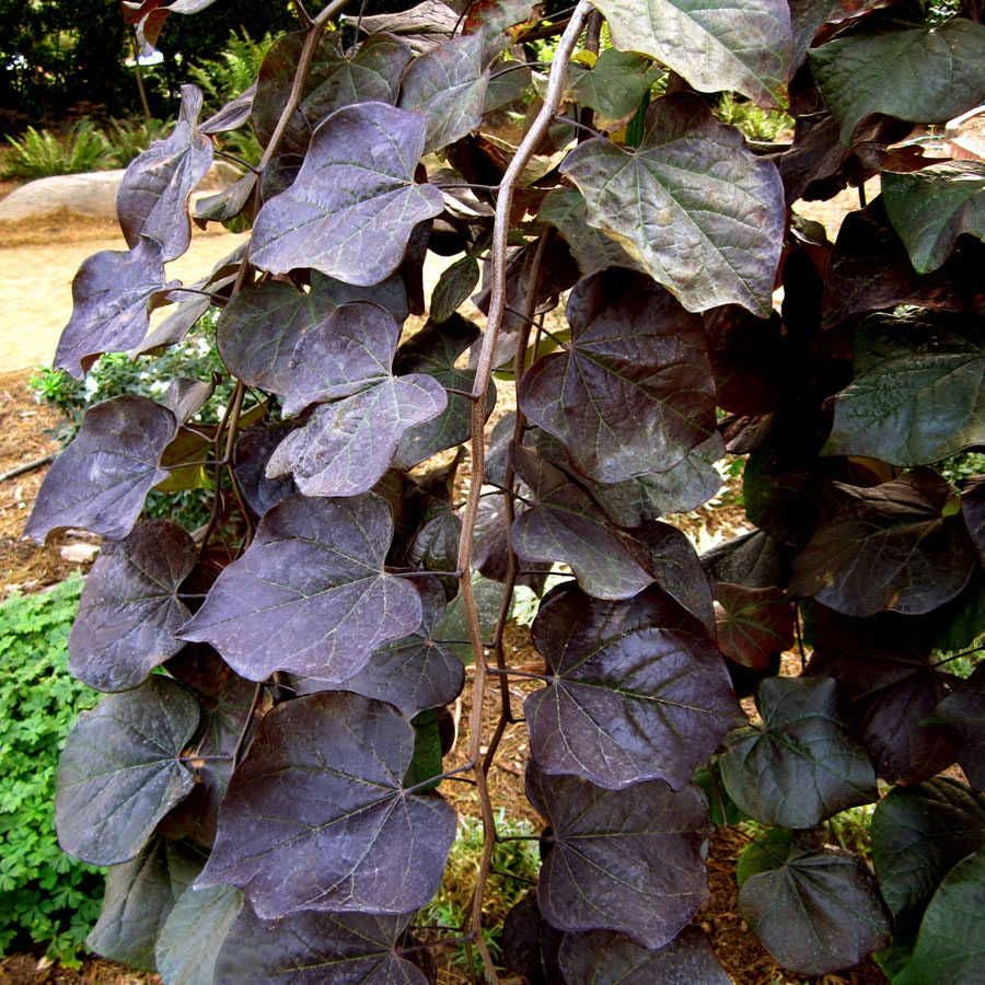 The blooms arise before the foliage in spring. Deep lavender flowers are borne on bright red stems and bracts. Very showy, they remain for several weeks before being joined by glossy, heart-shaped, maroon-red leaves held on pendulous branches close to the central stem of the tree.