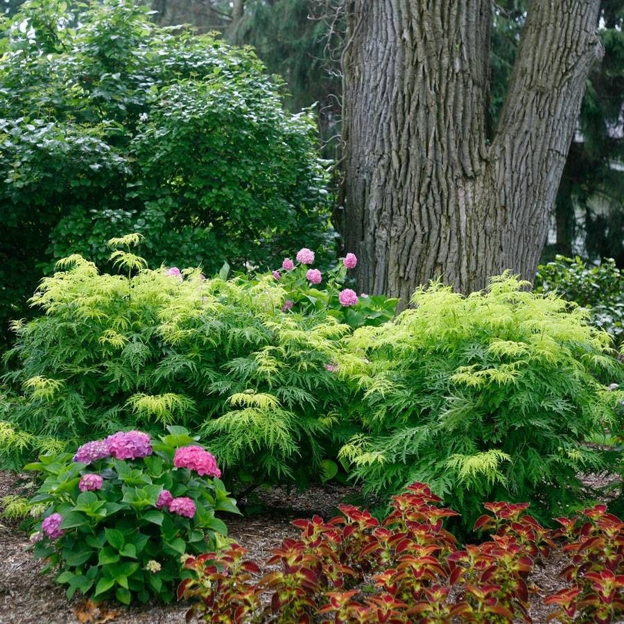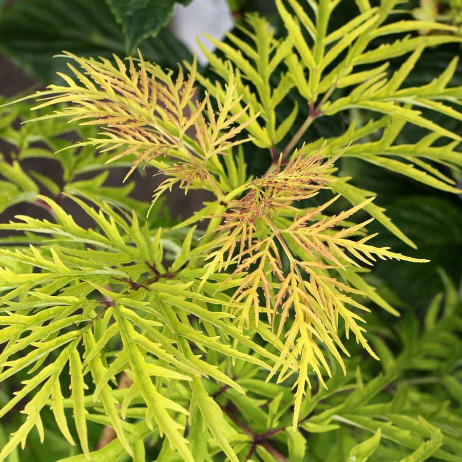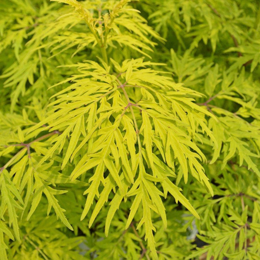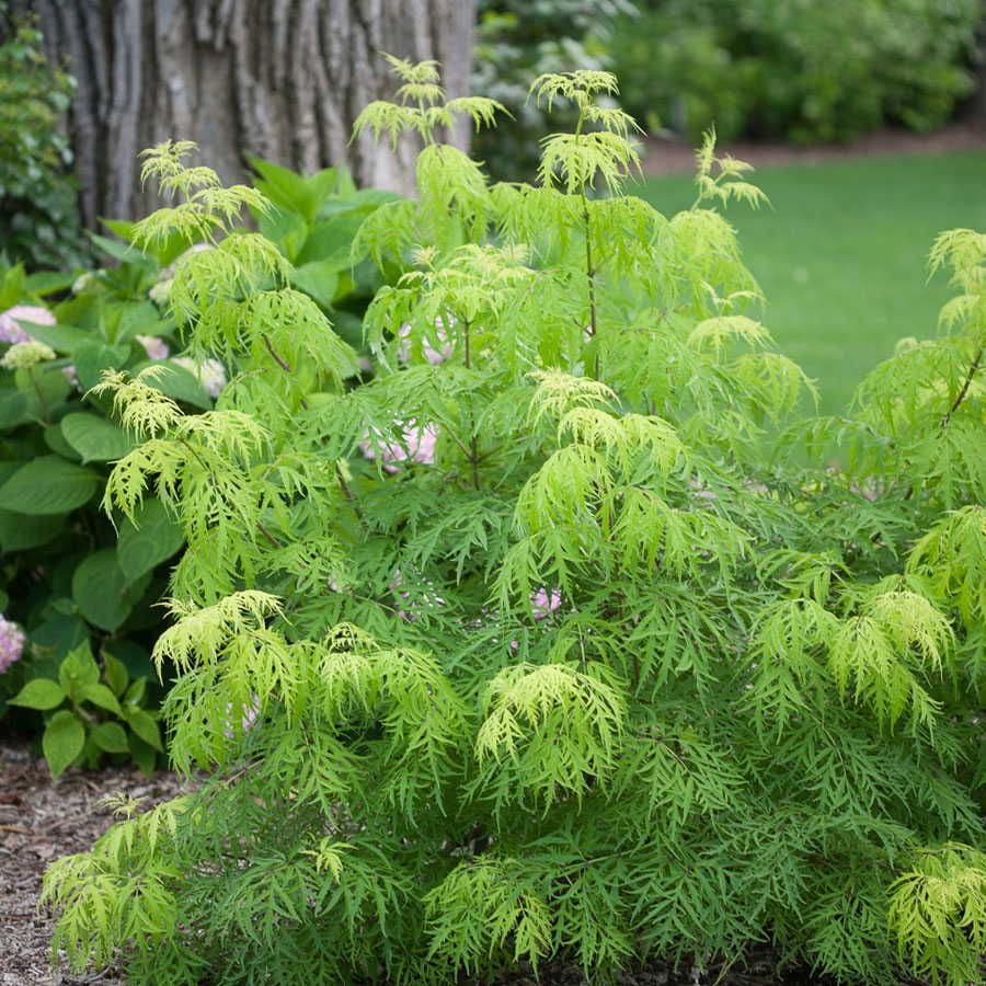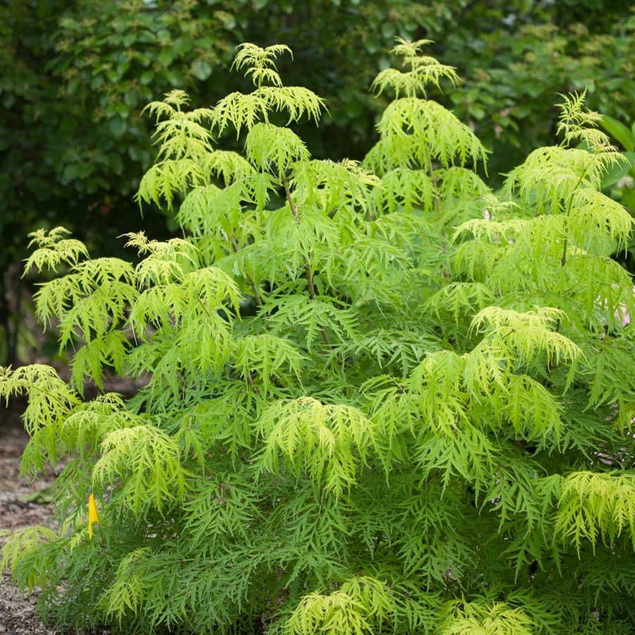 This spectacular Sambucus Lemony Lace® offers deeply cut, lacy leaves of gold and green that keep their color right through summer's heat, and even produces deep red berries that attract songbirds in autumn. Sambucus Lemony Lace® an enchanting, no-fuss addition to a foundation, hedge, or border planting. The chartreuse, ferny foliage makes Sambucus Lemony Lace® a whimsical addition to a fairy or gnome-themed garden.