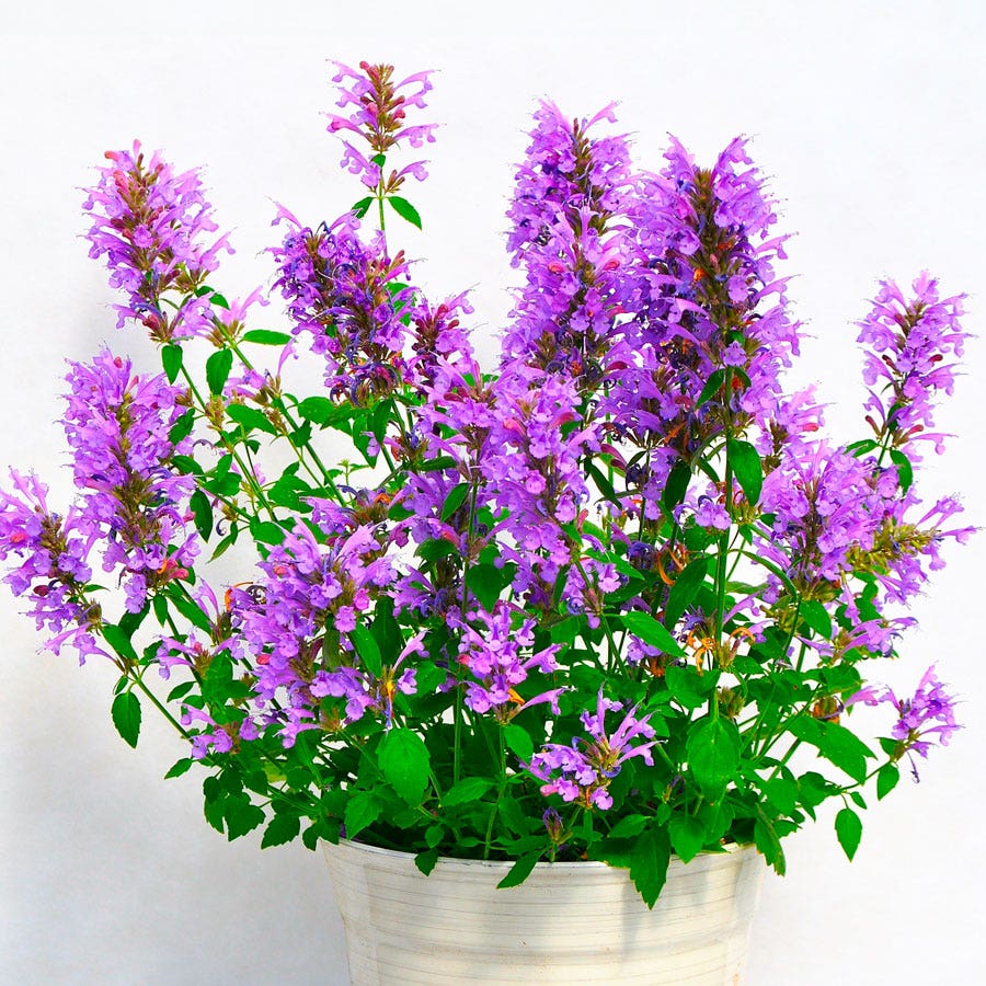 An Agastache hybrid, commonly called hyssop or hummingbird mint, Sunrise Blue Hyssop has an upright, clumping habit and a fast growth rate. Its gray-green foliage is mint-scented and can be used, fresh or dried, in teas. Hummingbird mint readily self-seeds, so it's a good choice for naturalized areas. And since it is well-adapted to dry soils, it's also good for rock gardens and xeriscapes. But the plant is a great container and garden plant, especially in mixed beds and borders.