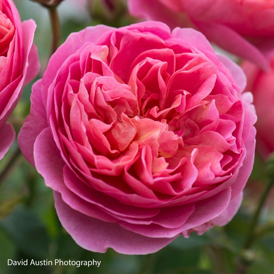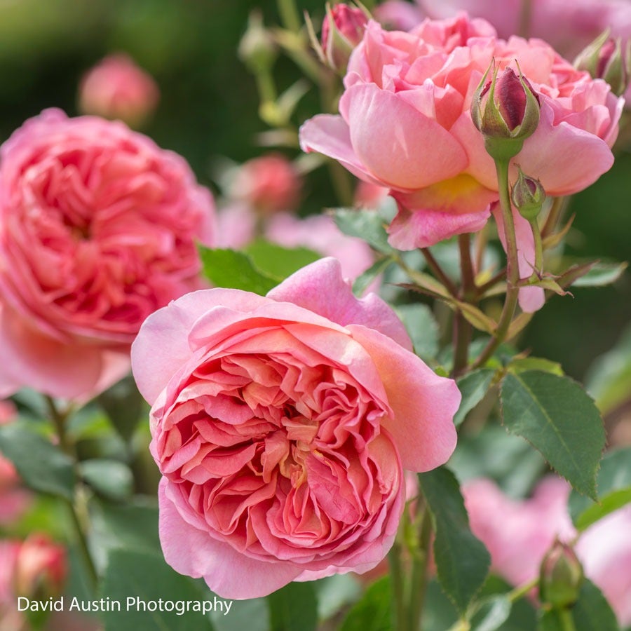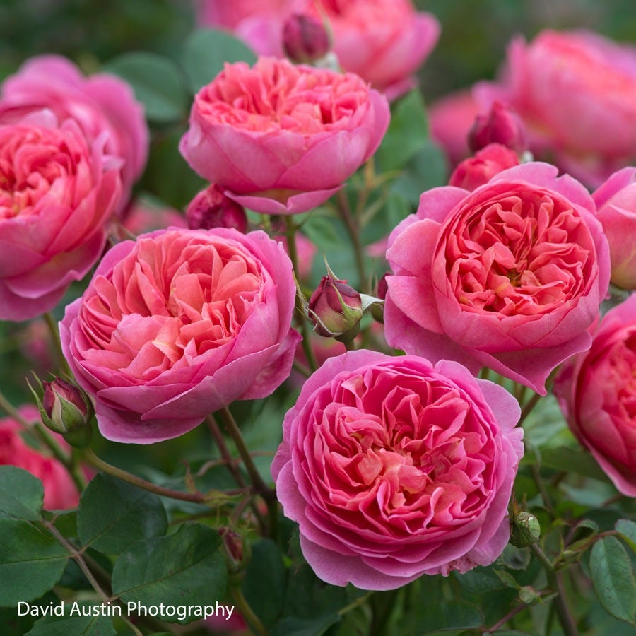 Naturally shrubby, this David Austin® English rose reaches 4 feet high and 4 feet wide at maturity and is arrayed in a harmonious blend of bubbly red buds and large coral-pink rosettes, lavish with 78 petals and redolent of myrrh with notes of hawthorn, elderflower, pear, and almond.