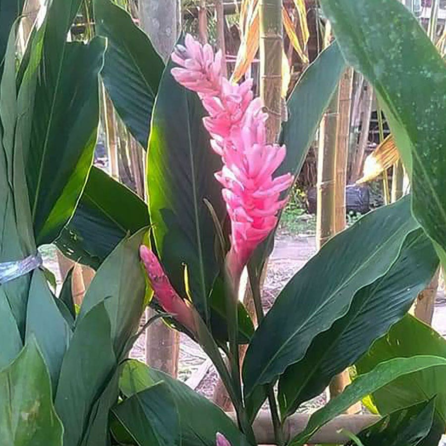 Plant Alpinia Pink Ginger, also known as ornamental ginger, in spring, and in summer (4½ to 5 months after shoot emerges) the bulbs bloom in 6- to 12-inch flower spikes of pink floral bracts and inconspicuous white flowers. Borne singly on long, leafy, cane-like stalks, the inflorescences attract bees, butterflies, and birds and are quite popular as cut flowers.