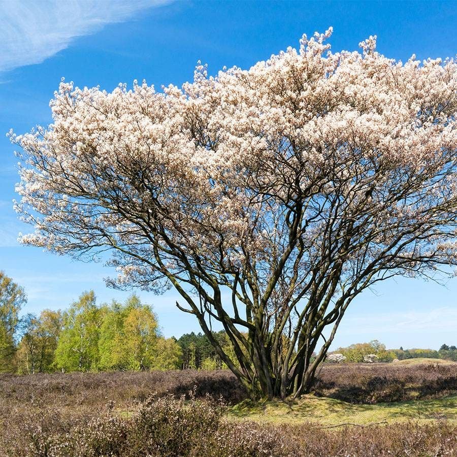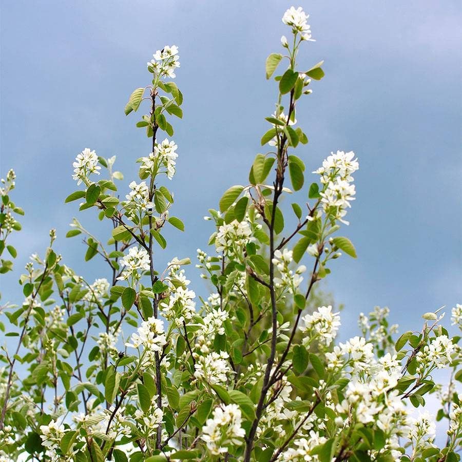 Amelanchier canadensis, commonly called shadblow serviceberry, is a deciduous, early flowering, large shrub or small tree which can grow up to 25-30 feet tall. It boasts showy, slightly fragrant, crisp white flowers in drooping clusters which appear before the leaves emerge in early spring contrasted against finely toothed, medium to dark green leaves that change to a stunning orange red in autumn. The flowers give way to small, round, green berries which turn red and finally mature to a dark purplish-black in early summer. The edible berries resemble blueberries in size and color and are often used in jams, jellies and pies! You won't be the only one who loves the little berries, your feathered friends will flock to this tree as well. It is easily grown in average, medium, well-drained soil in full sun to part shade and looks great in woodland and native gardens especially contrasted against dark or shady backgrounds which highlights its form, flowers, and fall color. Wherever you choose to plant it will delight you with seasons of interest.