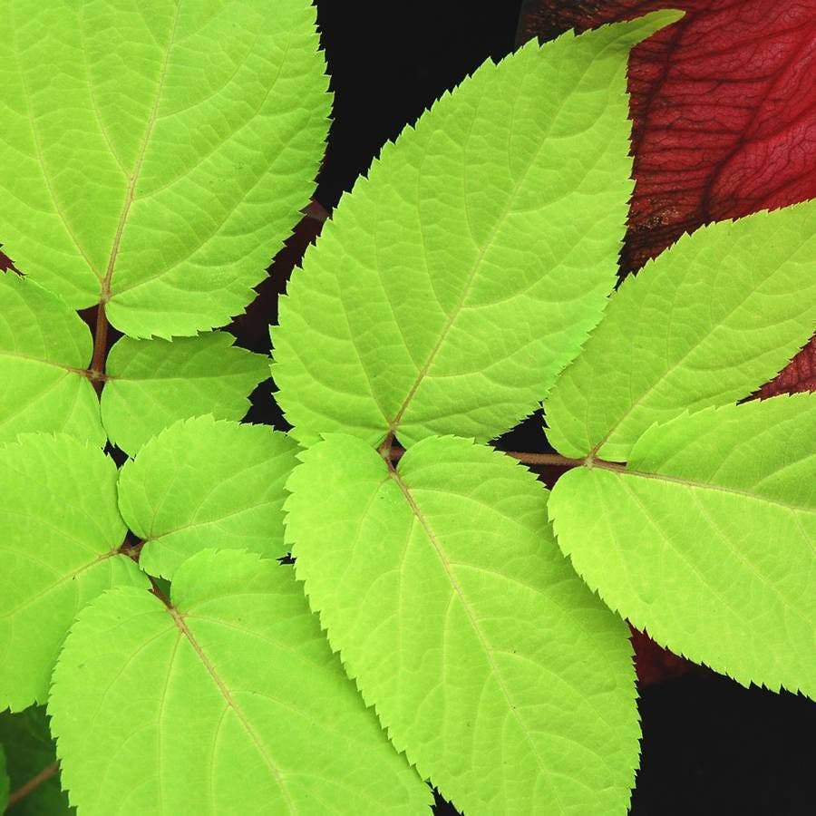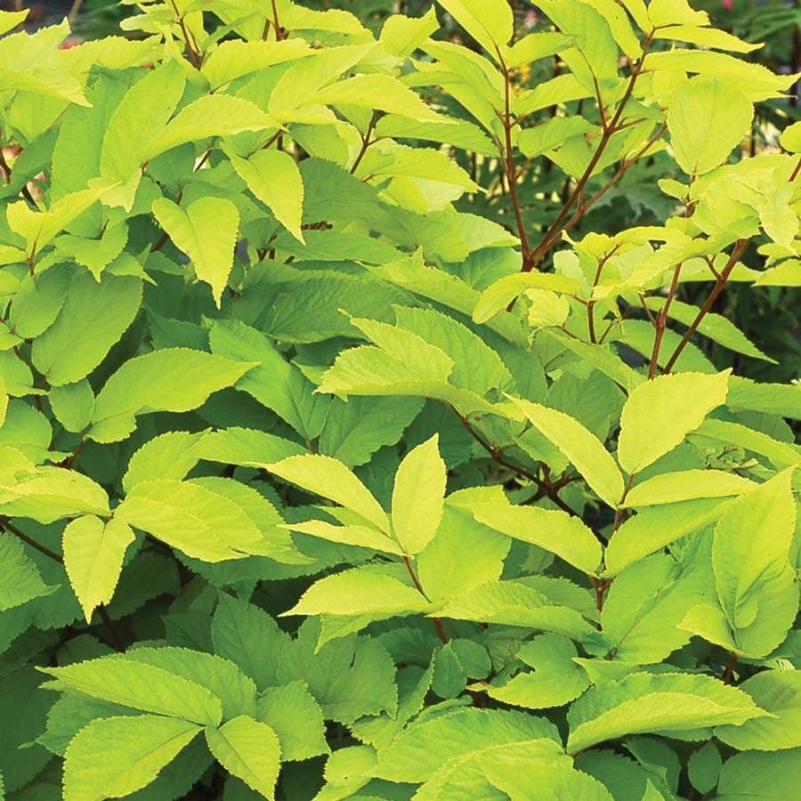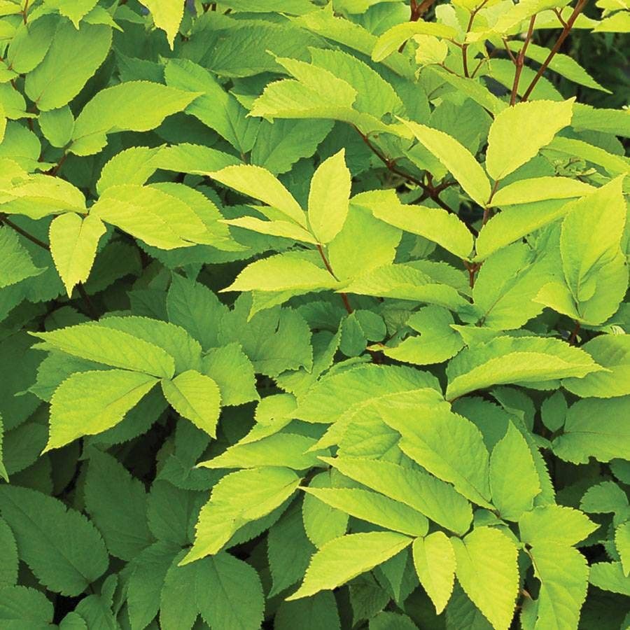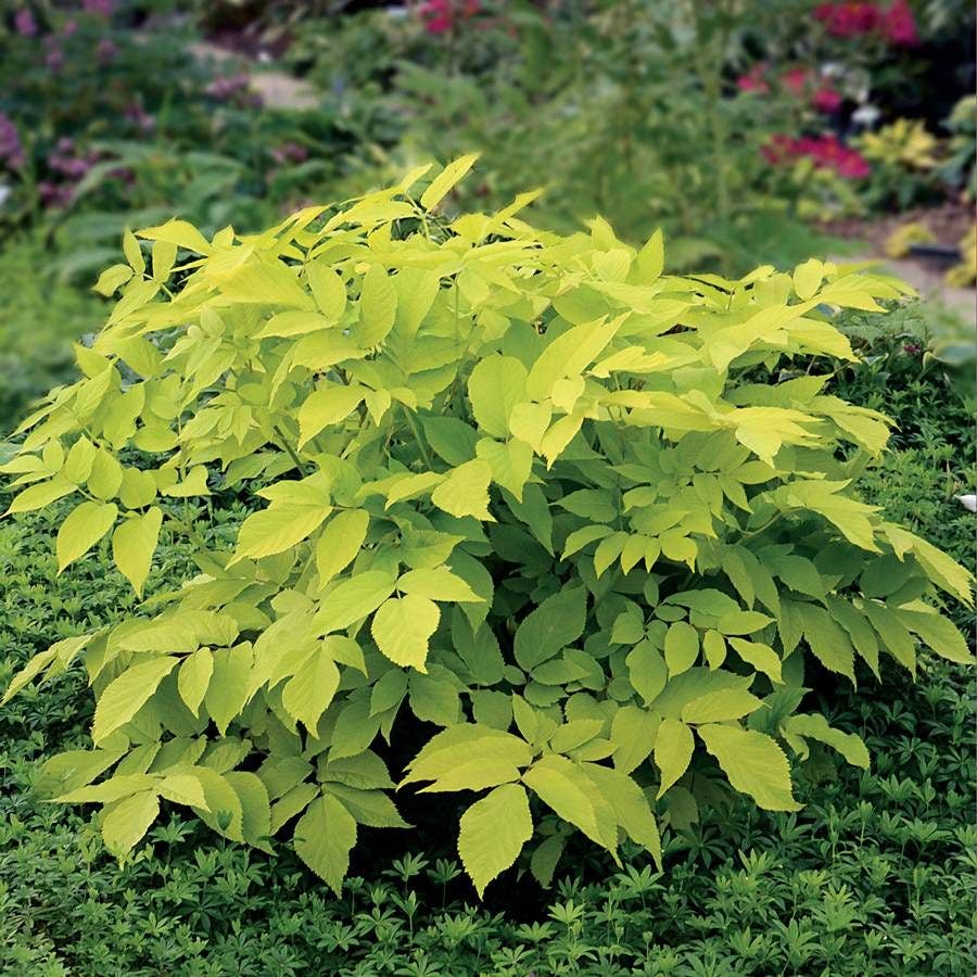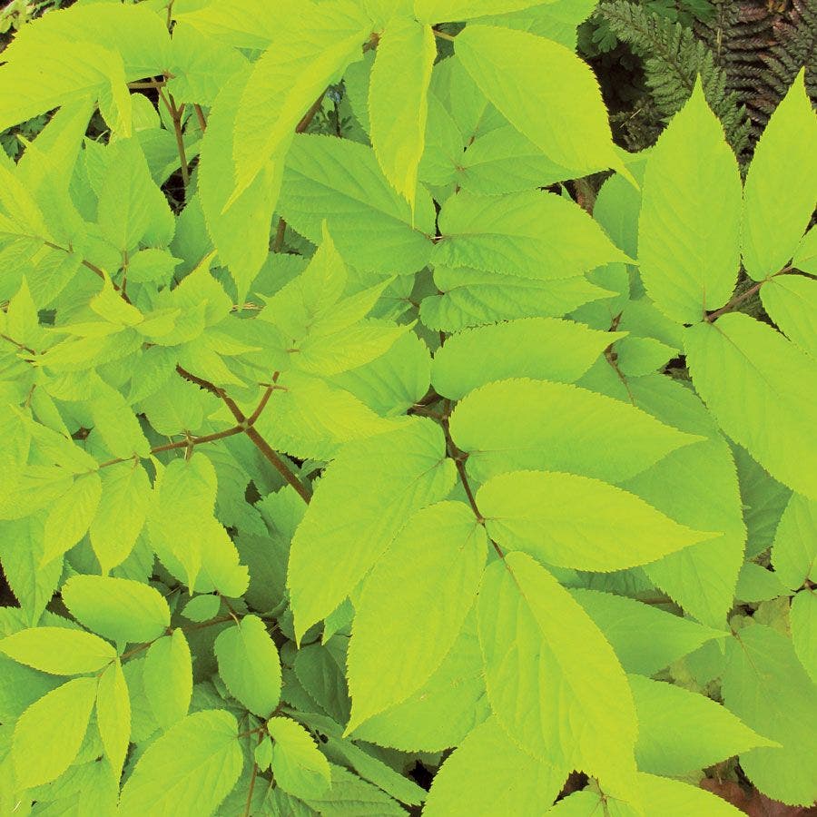 A lovely larger counterpart to traditional shade plants like Hosta, this Golden Japanese Spikenard thrills with bright red stems and gold compound leaves. These colors hold true all season, only "greening out" if the shade is too deep. Later in the season small white flowers grow in racemes, attracting pollinators, and then setting dark berries. Perfect for the back of any partly shaded border!