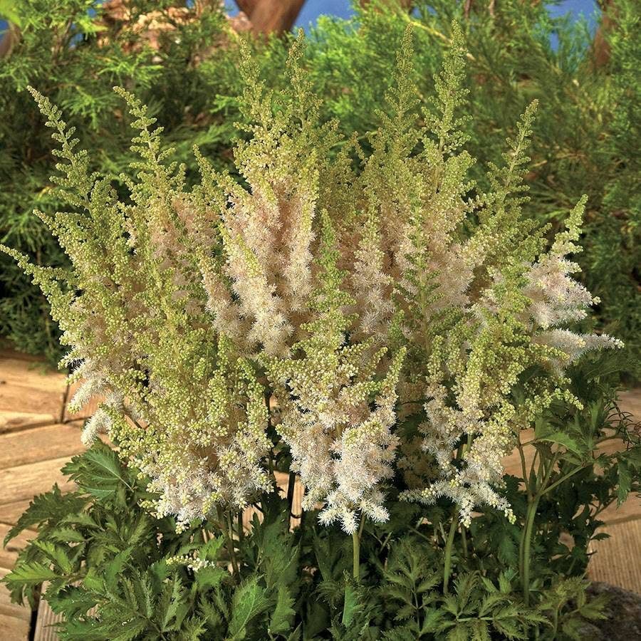 A member of Astilbe chinensis, Astilbe 'Milk and Honey', a late-blooming species, is perfect for extending your garden bloom time into late summer. The creamy white plumes turn a delicate light pink as they age. The foliage is deeply incised, coarsely textured, and often bronze-green in color. Contrasting beautifully with the pale plumes on top.