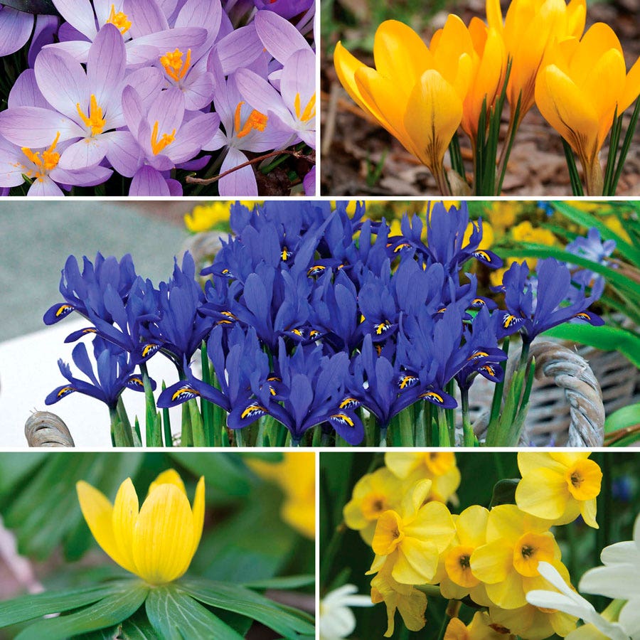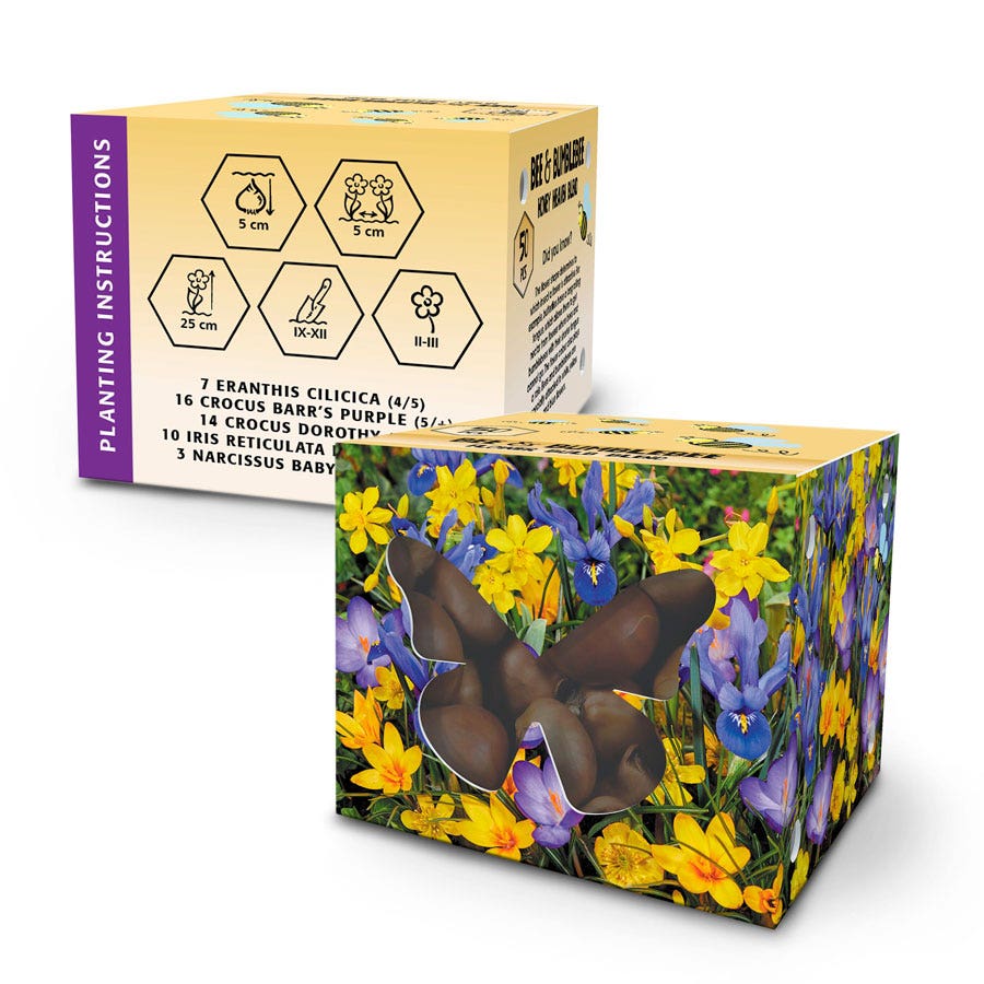 The decorative box contains 50 pcs: 14 Crocus chrysanthus 'Dorothy', small goblet-shaped yellow flowers with fine bronze lining; 16 Crocus tommasinianus 'Barr's Purple', small goblet-shaped flowers with white throats; 3 Narcissus jonquilla 'Baby Moon', soft golden yellow miniature daffodil with 3-5 small, sweetly scented flowers per stem; 7 Eranthis cilicica, upward-facing, buttercup-like bright yellow flowers on 3-4" stalks; and 10 Iris reticulata 'Harmony', large deep blue flowers with gold crests, white streaks, and a fragrance.