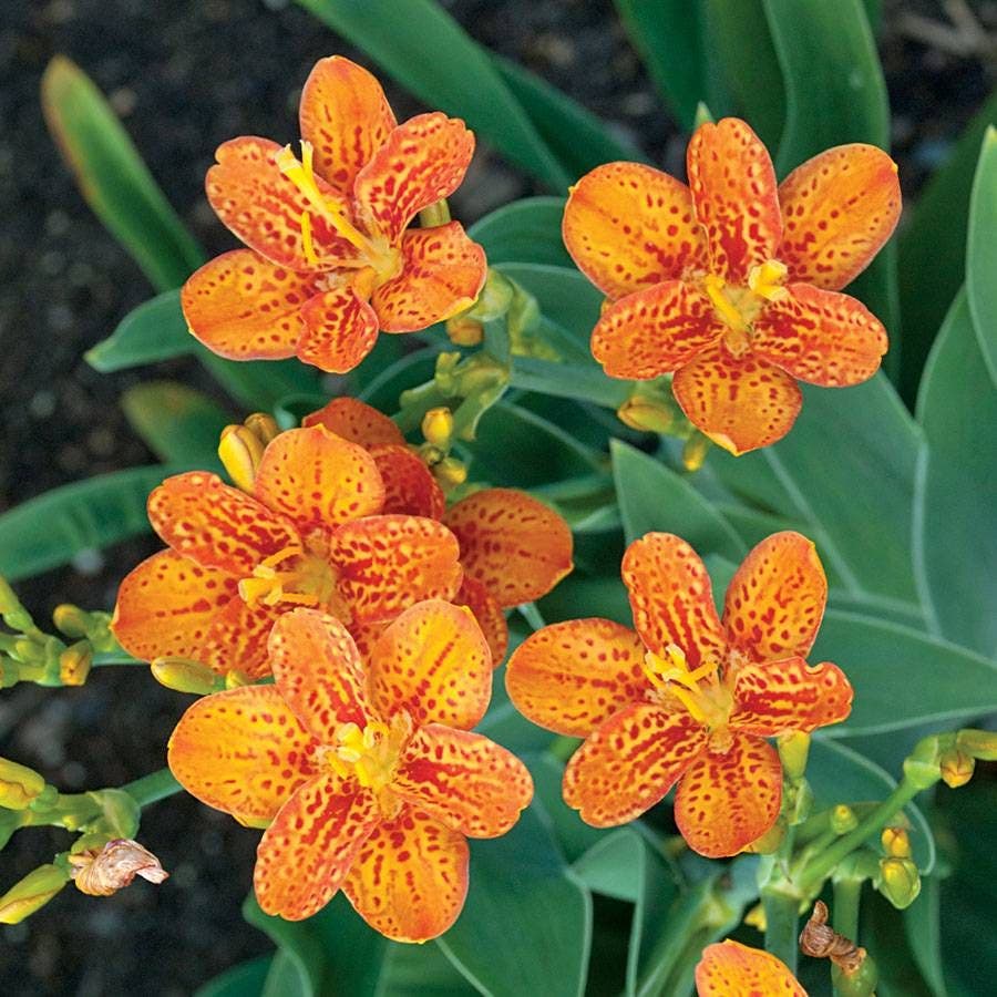 Who says freckles are a blemish and aren't pretty? This Blackberry Lily is a phenomenal beauty and a must-have for cutting and pollinator gardens with freckles and all. Butterflies adore its 2-inch orange speckled blooms and its sturdy stems are just begging to be snipped and used in arrangements. This gorgeous perennial is a shout of color sure to bring sun-drenched landscapes to life. In contrast to its fiery blooms, cool green sword-shaped foliage rises along side it with equal grace and beauty. In the fall the flowers turn into tan seed pods which them burst into black seeds which resemble blackberries. In just about any season this curious plant is eager to please but blooms in the late summer. Give it a change in your garden and you won't be disappointed in its vigor and performance and stunning beauty.