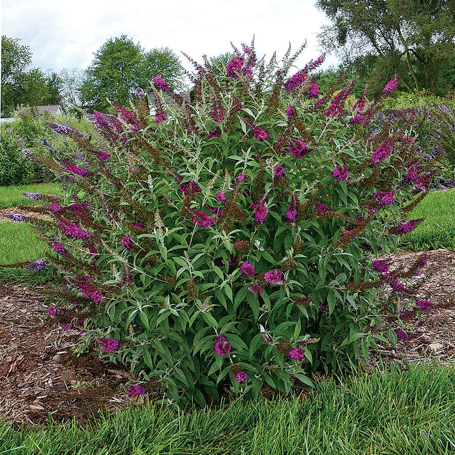This gorgeous compact Buddleia reaches a mature size of 3 to 5 feet high and about 3 feet wide, perfect for large containers and smaller gardens. And it responds well to shaping. Its bold magenta plumes stand out all over the upright, semi-bushy habit of attractive medium green-greyish foliage. The fragrant flowers start arriving in the first season, and they last from early to midsummer into fall. What a treat for gardeners and butterflies alike!