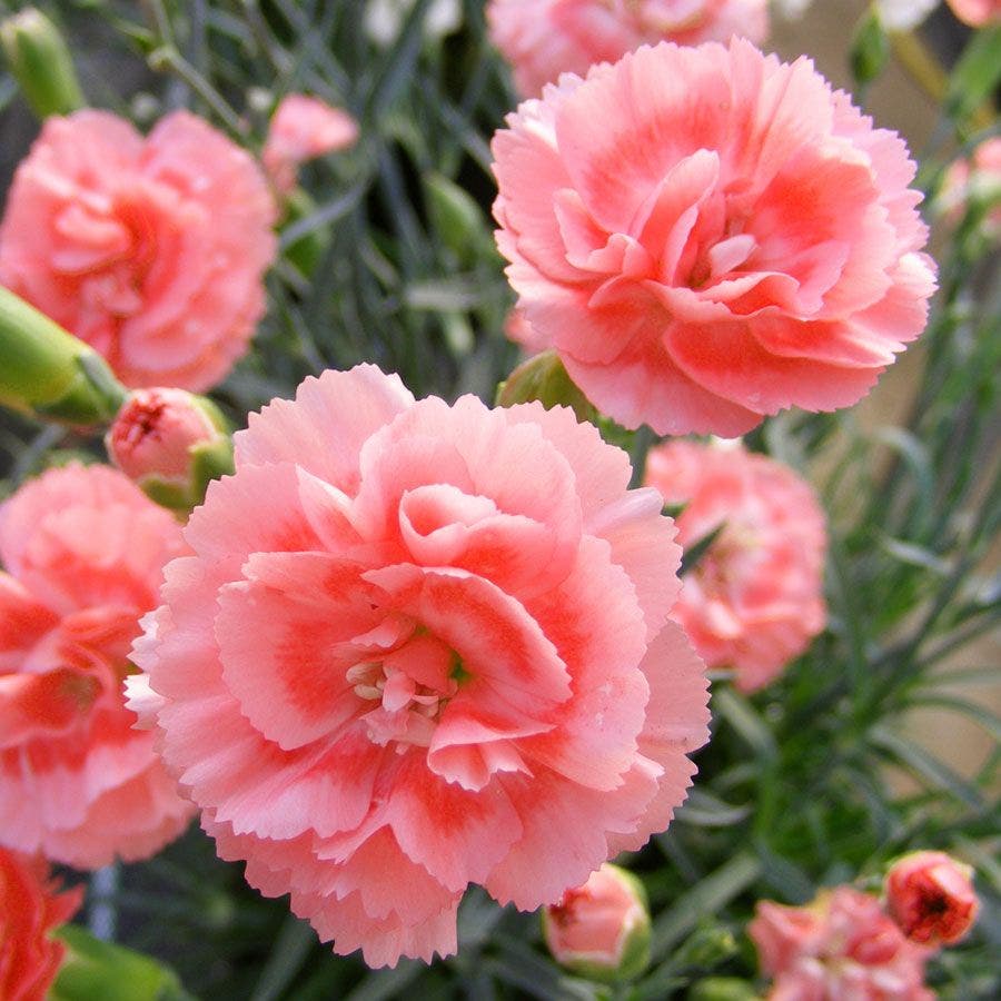 Dianthus Scent First® 'Tall Romance' captivates with its coral colored carnations, standing as a living testament to the beauty and allure of carnation coral blooms. This exquisite variety, part of the Dianthus Scent First collection, is adorned with coral colored double blooms, enveloping the garden in a spicy aroma that attracts a plethora of pollinators. The robust stems and gray-green foliage perfectly complement the delicate coral carnation blossoms, making them an ideal choice for both garden displays and cut-flower arrangements.