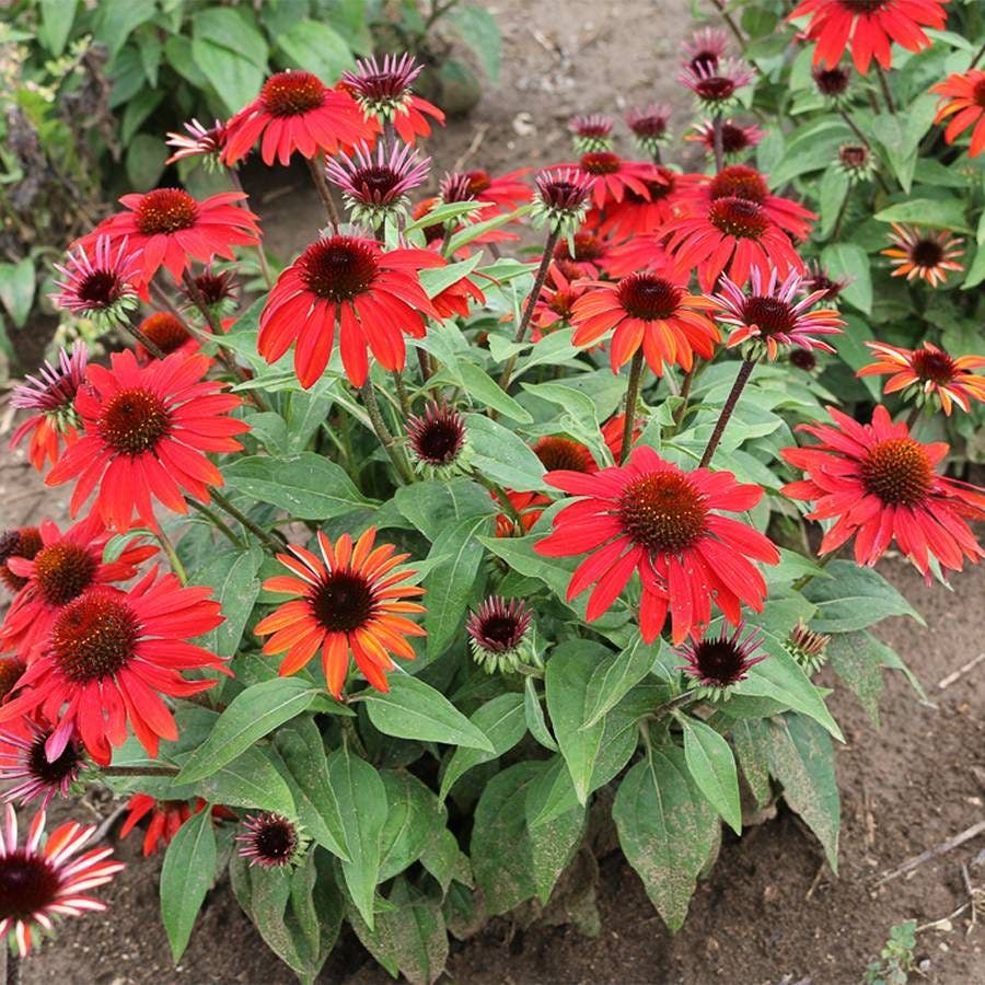 Forget the town, it's time to paint your landscape red with Echinacea Sombrero® Sangrita Red coneflowers. This compact and robust plant is positively overloaded with flame red blooms from late spring all throughout the summer. The showy, sun-loving blossoms of Echinacea Sombrero® Sangrita Red are magnets for butterflies and seem to hold the warmth of the sun in each vivid, pointed red petal. They will fill your summer garden with bold color and life.