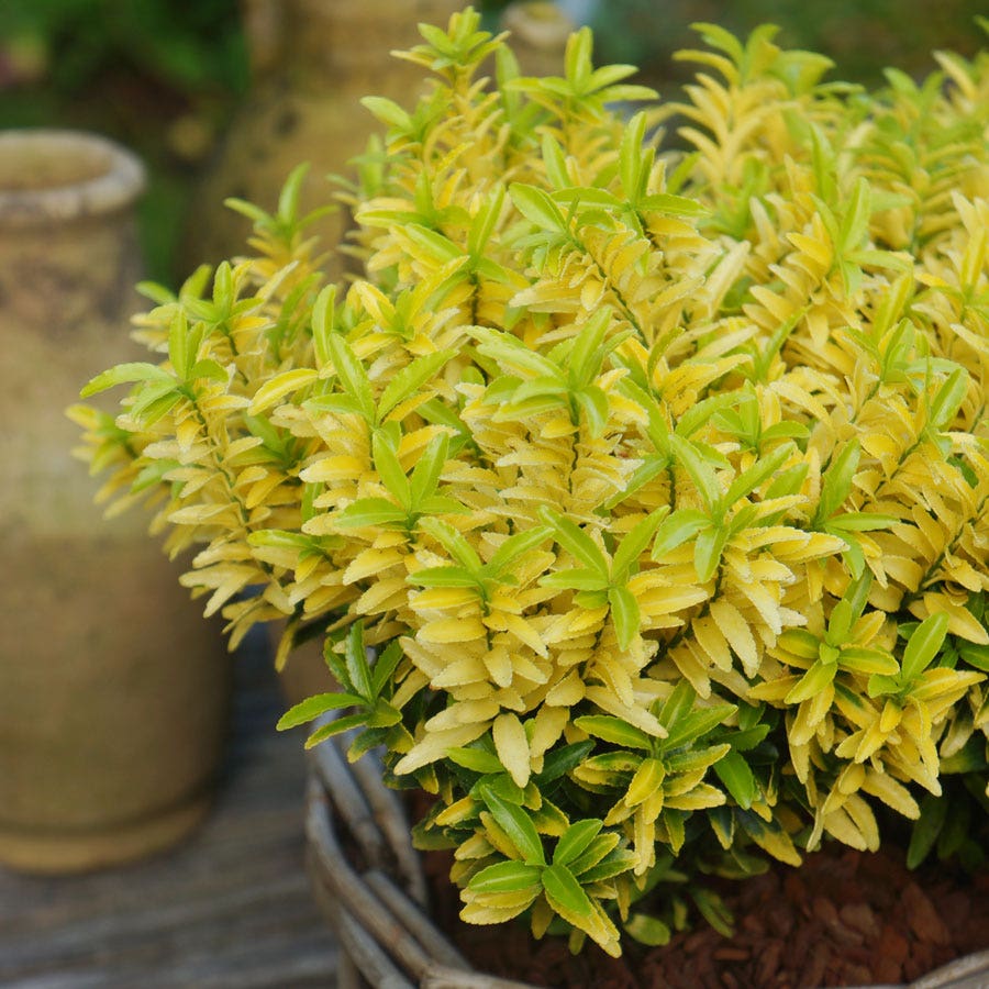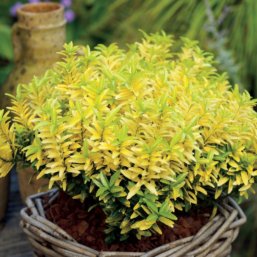 Here it is, the container shrub you've been looking for! 'Happiness' is a dwarf Wintercreeper that greets spring with fresh golden leaves and keeps its neat, rounded, cushion-like habit. What a joy it would be in pairs flanking a walkway or marching up the steps!