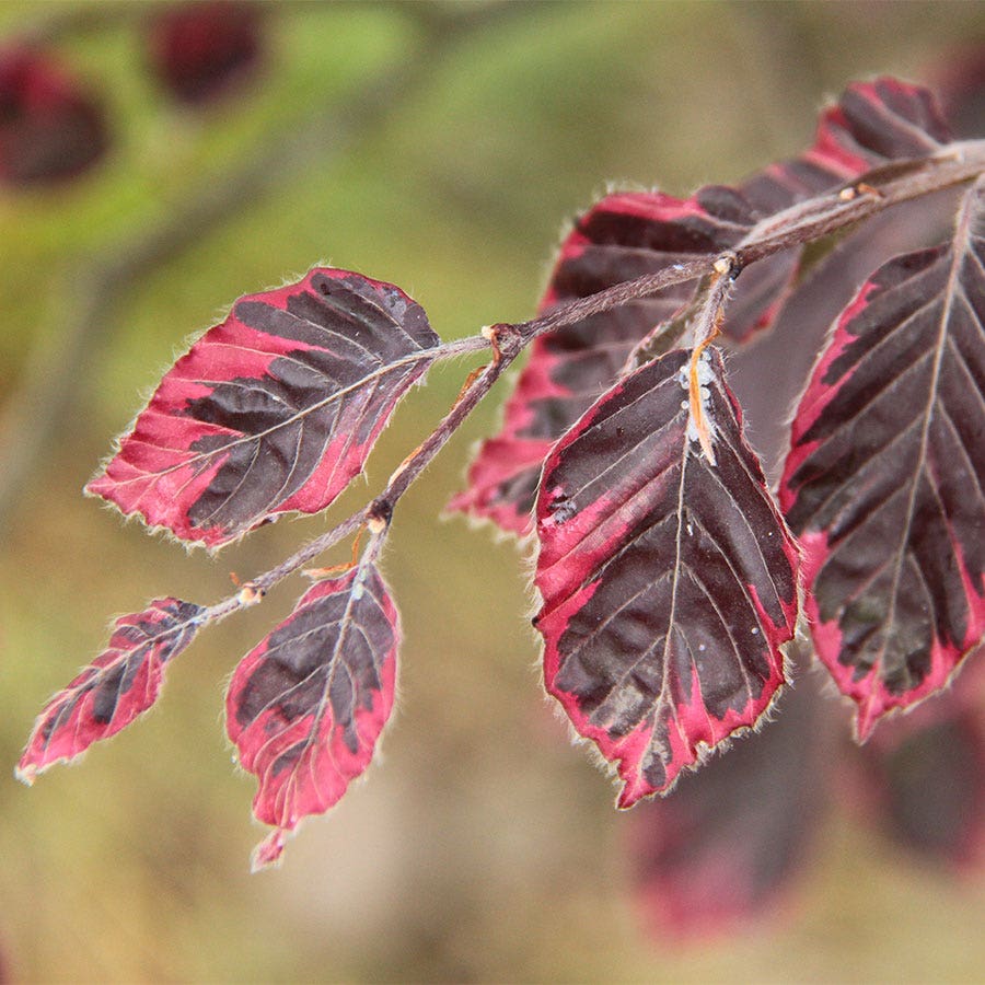 (Synonyms 'Tricolor,' 'Purple Tricolor.') Among the most lovely of all European Beeches, this boldly variegated slow grower offers extraordinary color three seasons of the year. Its foliage is heavily rippled and textured, with a sculpted look that silhouettes beautifully. In spring and summer it is green with generous dark pink and white markings around the edges; in autumn it burnishes a bright shade of copper.