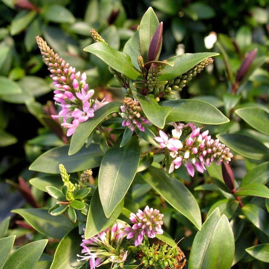 Hebe 'Pretty in Pink' features stunning dark green and burgundy foliage that will stay in your landscape all year long. The contrast between the colorful foliage and sweet pink blooms enhance the overall effect of the shrub. It's a very hardy spreading evergreen shrub that looks incredible cascading over garden edges and makes an effective border plant. It does best with moist, well drained soil and a partly shaded spot. You will not be disappointed by the incredible color in this compact little shrub. Grab one for your landscape today!