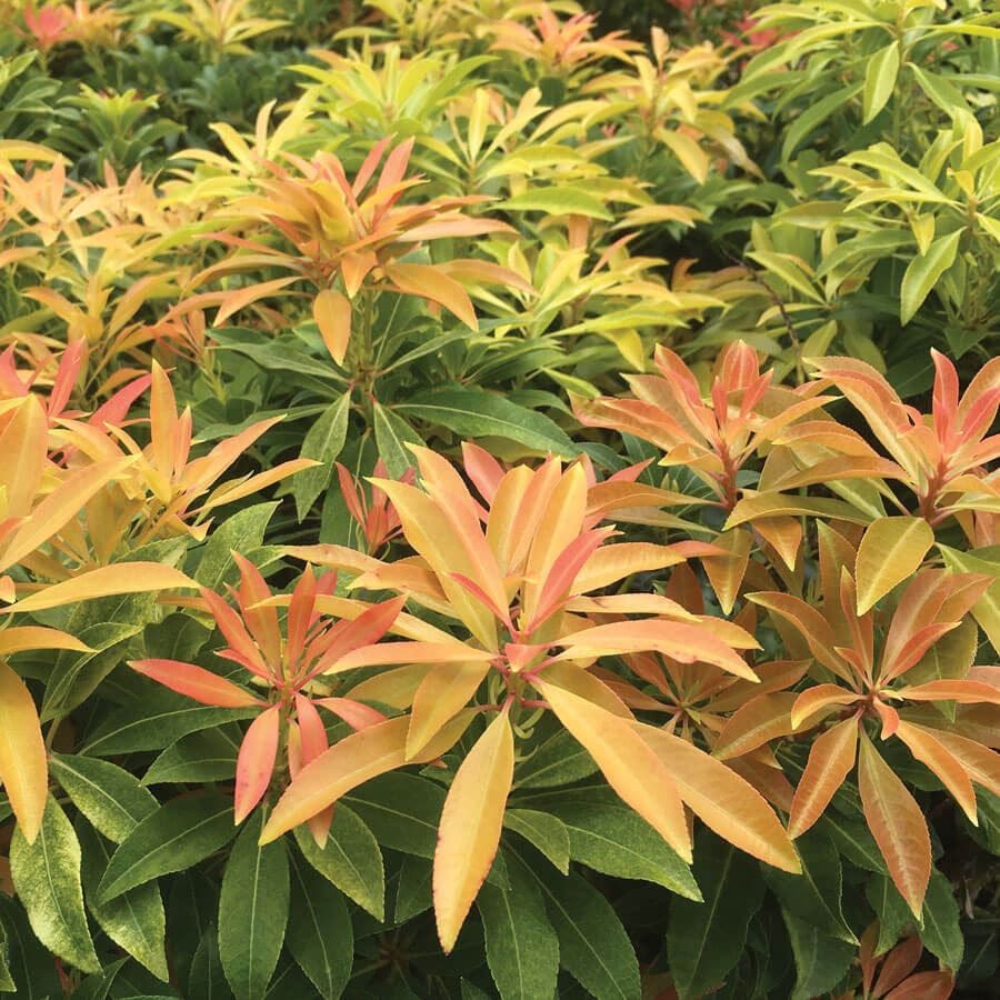 A stunning shrub of extremely bright foliage and charming flowers providing year-round interest. New whorls of spring leaves metamorphose kaleidoscopicallyemerging flame red, fading pink, and paling creamy whitebefore reaching glossy dark summer green. It creates a striking backdrop for the hanging clusters of bead-like blushing buds (set the previous summer) blossoming into large showy panicles of waxy, urn-shaped, white flowers, similar to lily of the valley.
