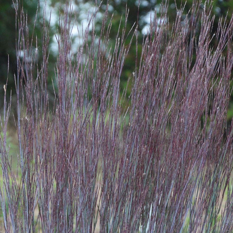 The stems of this Little Bluestem really are blue in spring and summer! They have a silvery glint that catches the eye, and in autumn the show continues when the green foliage turns a rich shade of dark purple. Tan seedheads -- very attractive to birds! -- complete the fall show, and make great fresh and dried cuts for the vase.