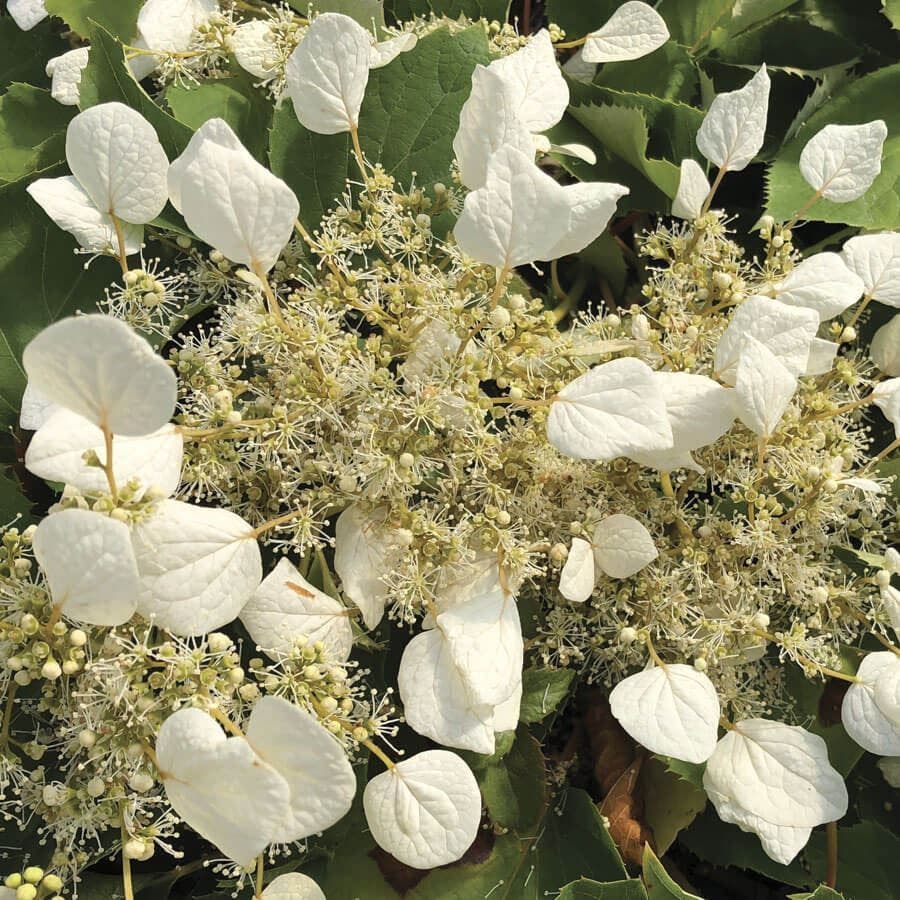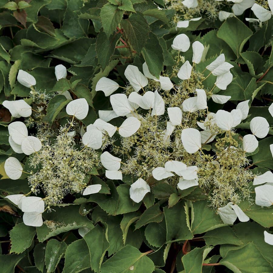A superior variety of Schizophragma, this alluring false hydrangea vine matures quickly to generate loads of lightly fragrant white blooms and lovely young purple shoots. Schizophragma FLIRTY GIRL™ grows up to a whopping 40 feet high and 5 feet wide and blooms in early summer.