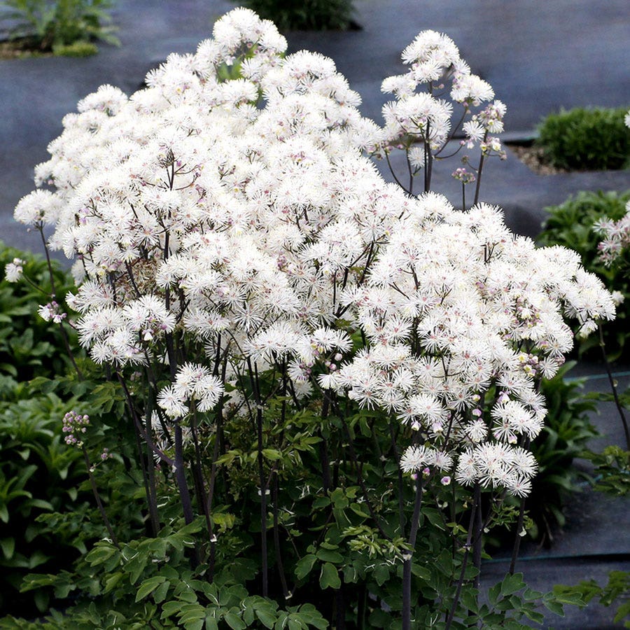 Our native Meadow Rue has never been so magnificent! Nimbus™ White is a stunning selection with abundant snowy blooms from late spring into summer, showy lavender-pink seedpods, and dark stems. It stands tall and proud in the sunny to lightly shaded perennial garden!
