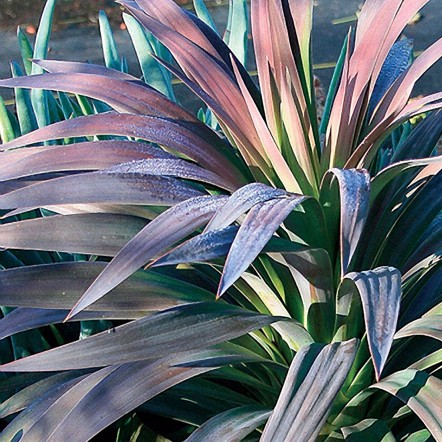 This long-lived, rather slow-growing perennial sets new leaves straight up from the center of the rosette-like stem (after time, it will grow several such stems). The new foliage is bright green, turning shades of maroon and icy white before settling into a deep purple. The foliage is very fleshy and firm, but not spiky.