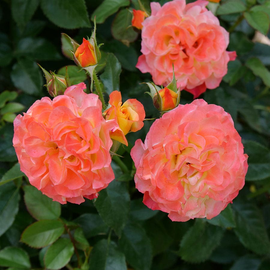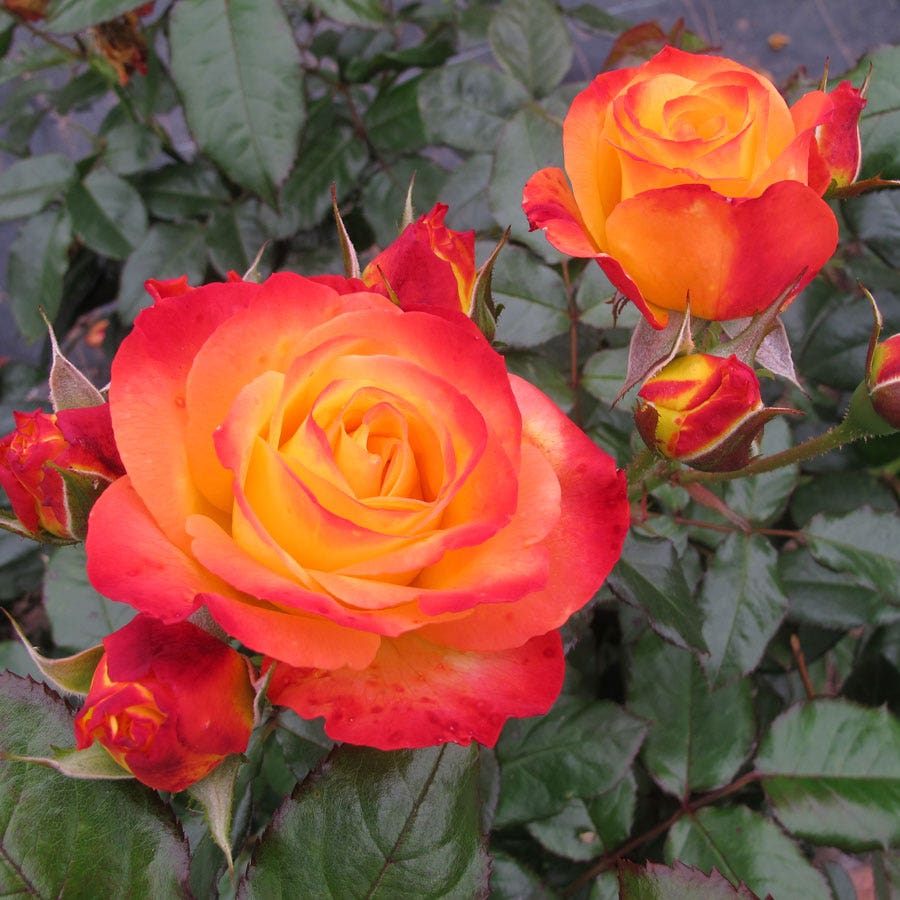 A Proven Winners® ColorChoice® Flowering Shrubs variety, Rosa Oso Easy En Fuego™ is a deciduous shrub that blooms throughout summer. Intensely colorful, the large flowers exhibit shades of yellow and red as they fully spiral open to a brilliant electric orange color. Set against healthy glossy green foliage, the flowers create fiery displays in the garden, container, or vase. The shrub makes an excellent specimen but is shown to best effect when massed or grouped in mixed beds, borders, and foundation plantings.