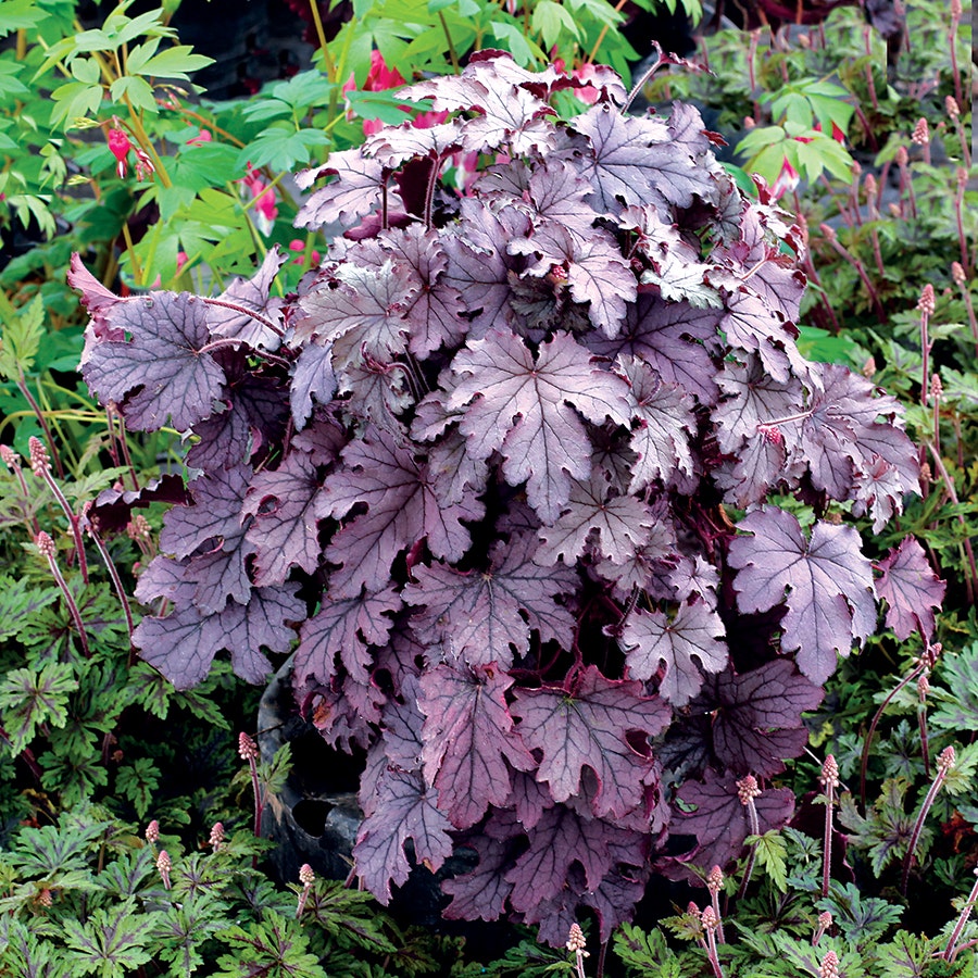A vigorous and vibrant choice for the shade garden, this variety boasts silvery purple lobed foliage which grows in a delightful trailing habit. A bold color statement for the shade garden, you'll hardly find a deeper, more rich purple anywhere else. Let the bold color fill your landscape all year long, even during the bleak winter months. Plum Cascade is an astounding choice for foliage interest, but even its small flowers are charming, especially since they tend to invite hummingbirds and other pollinators to fill your landscape with more color and life! This variety is a breeze to maintain and will thrive best in loamy, moist soil. Plant 'Plum Cascade' in your shady borders, beds, and containers and watch as the luminous purple foliage brightens up your garden month after month.