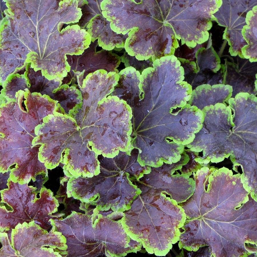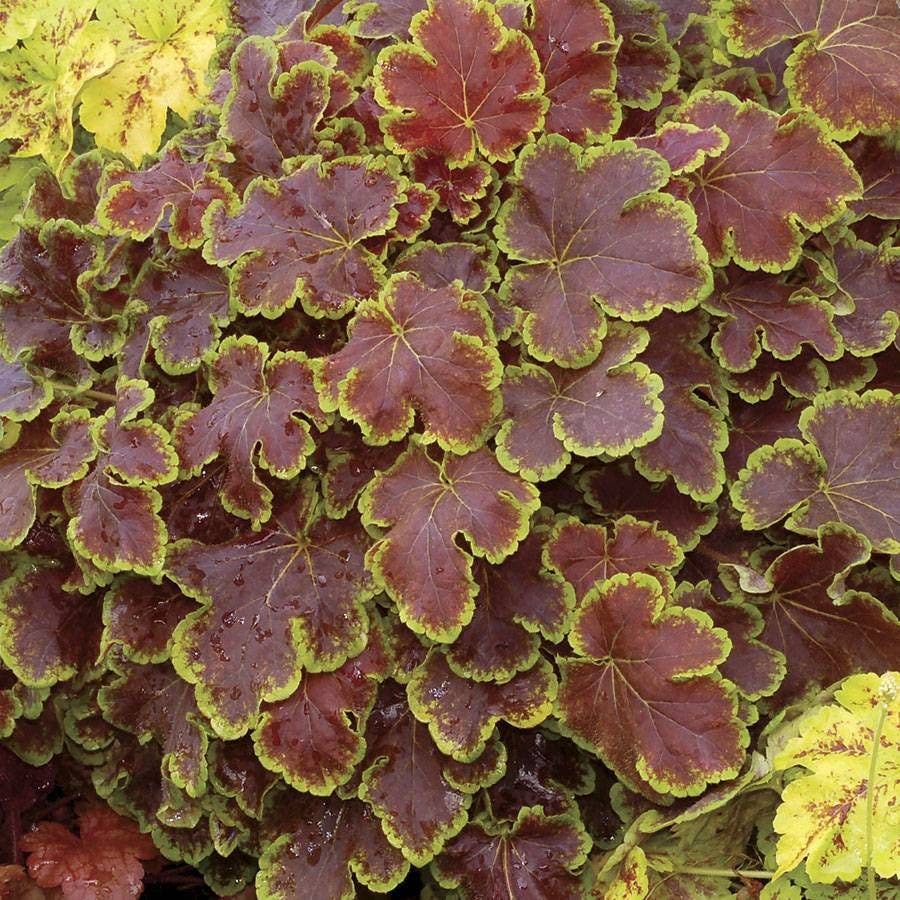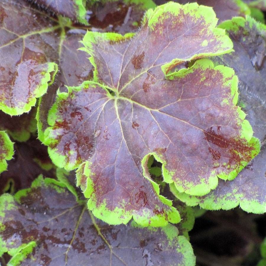 'Solar Eclipse' Heucherella, a star in the garden, brings the allure of a solar eclipse to your outdoor space. This standout variety, often referred to as 'Solar Eclipse' foamy bells, captivates with its mahogany red center bordered by bright lime green, embodying the dramatic contrast of a solar eclipse. The 'Solar Eclipse' Heucherella, a must-have for enthusiasts of foamy bells, thrives in well-drained soil, showcasing dense crowns and leaves of red brown.