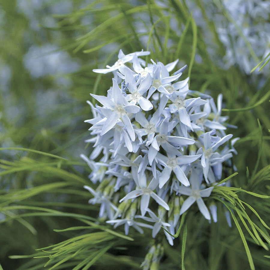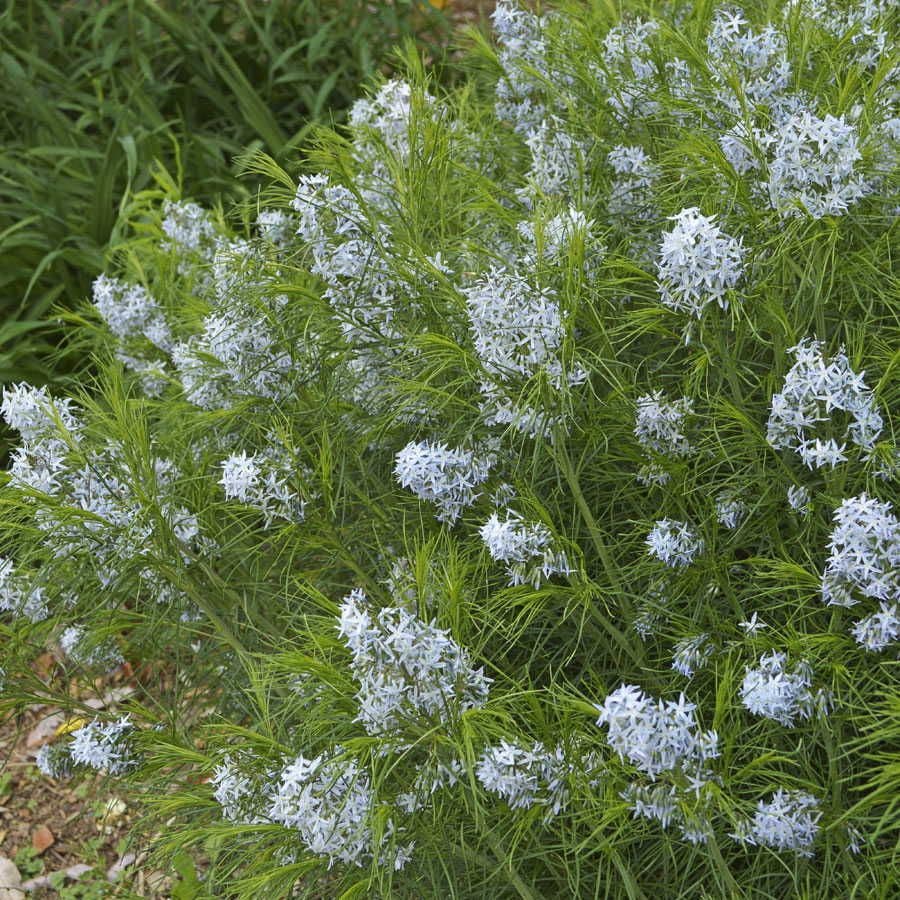 Amsonia Arkansas Blue Star Flower is a modest little plant, just 3 feet tall and 4 feet wide, with a bushy, unfussy habit that gives little hint of the riches it has in store for you. A good neighbor in the border or bed (it is not invasive, but can hold its own with competing roots), it is especially attractive planted among <#prodlink#"48052">ornamental grasses and in front of fragrant shrubs such as <#prodlink#"46709">Clethra 'Ruby Spice,' which not only shares its sweet scent with Amsonia but also participate in the fall foliage show!