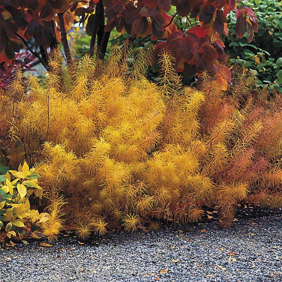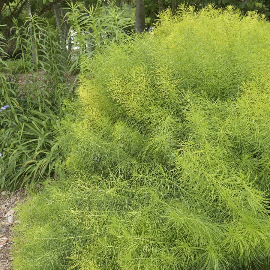 Every season brings a new color show with this delightfully easy, hard-working native plant. In late spring and early summer, masses of tiny, sky-blue blooms add cool tones to the sunny garden. In summer, the finely-cut, feathery dark green foliage forms a rich backdrop for your showy annuals and perennials. And in fall, the leaves turn a blazing golden-yellow that rivals Japanese Maples for intensity and beauty!