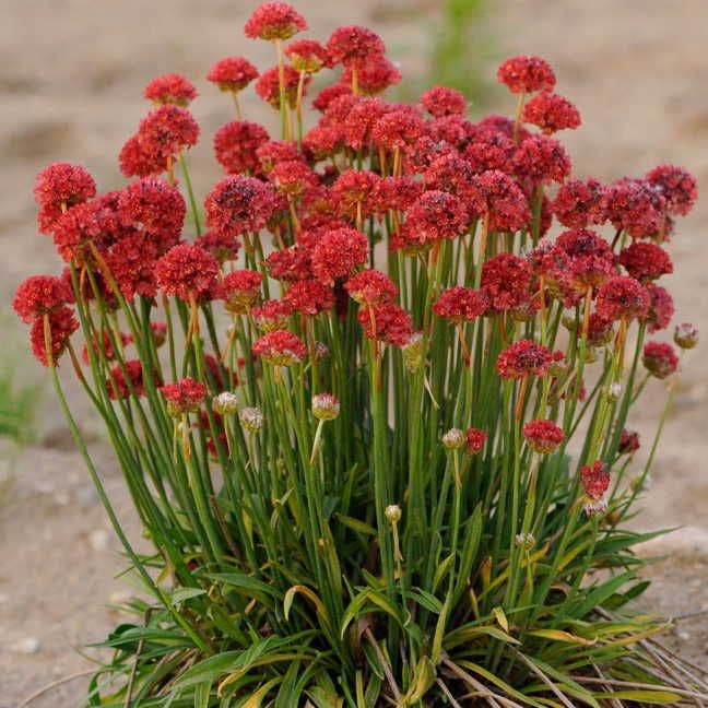 With larger, longer-lasting flowers than the more familiar A. maritima cultivars, this Thrift is a low-maintenance pleasure for sunny to lightly shaded gardens. The 1-inch pompons of deepest red make stellar fresh or dried cut-flowers, and if deadheaded promptly after its heavy spring bloom, this plant will repeat intermittently all summer.