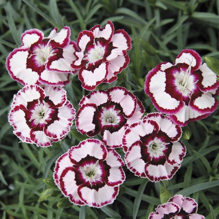 Dianthus Raspberry Swirl is a captivating addition to any garden, known for its enchanting display of double blooms that draw the eye and heart. With ruffled petals transitioning from near-white to powder pink and finally to radiant white, each flower is edged in a deep maroon that matures into a striking magenta. These red and white carnations, emerging from classic blue-green foliage, are a magnet for butterflies and hummingbirds, enriching your garden's biodiversity.
