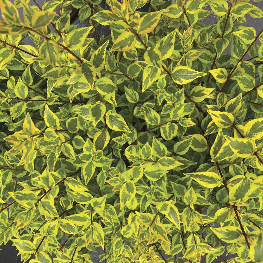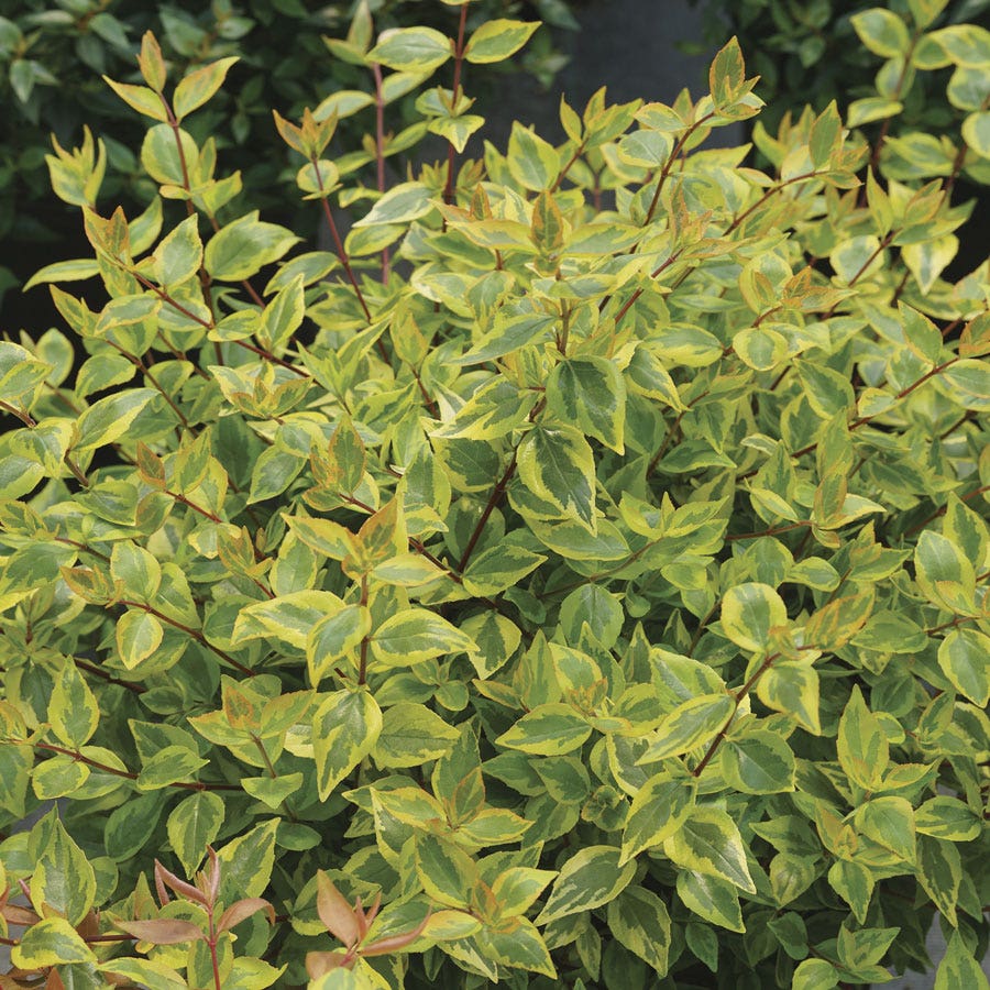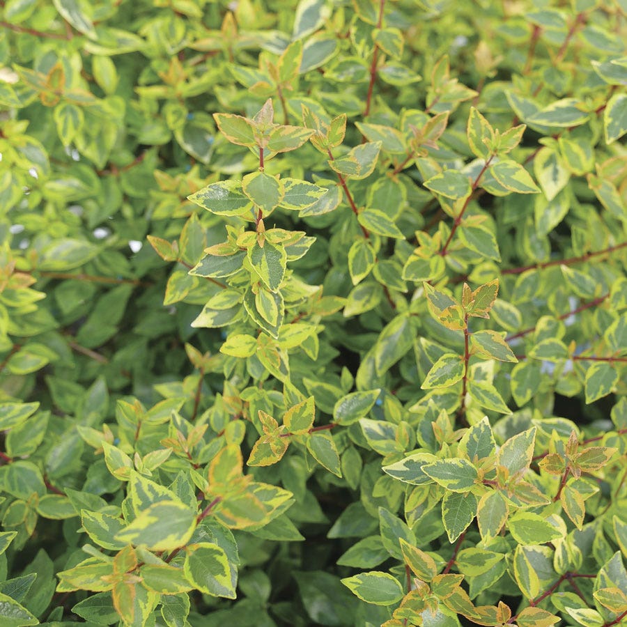A Proven Winners® ColorChoice® Flowering Shrubs variety, Abelia Brilliantina™ is a semievergreen perennial shrub grown for its attractive foliage and months of fragrant flowers. A unique abelia, Brilliantina is not only bold and beautiful but also well-behaved, with fewer errant shoots that need pruning. Its slender, gracefully arching dark-red stems bear bright variegated green, yellow, and orange leaves, which hold their variegation better than most, and clusters of bell-shaped, pink-tinged white flowers that sustain summer pollinators, including bees, butterflies, and hummingbirds.