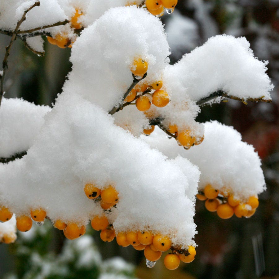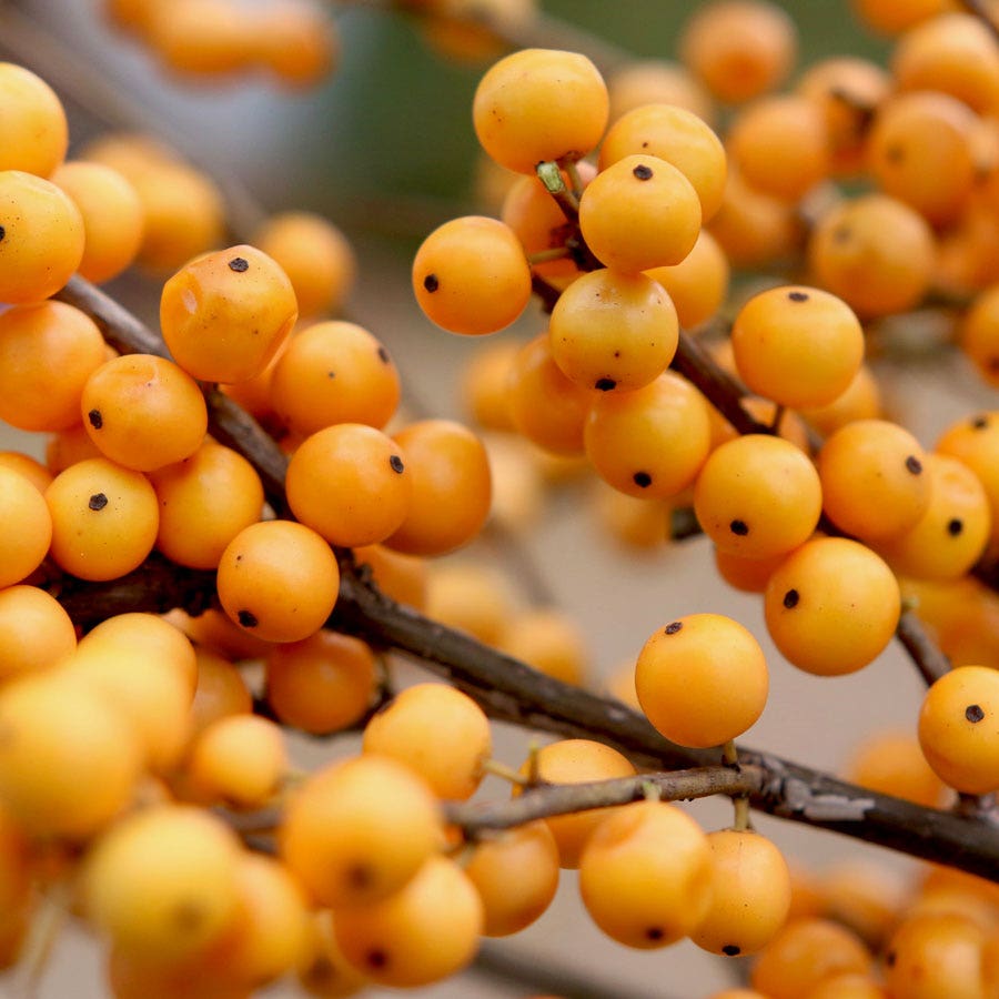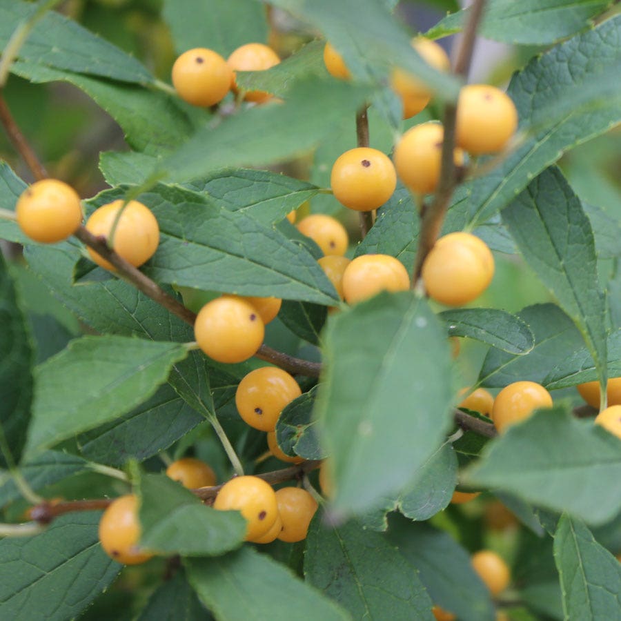 A Proven Winners® ColorChoice® Flowering Shrubs variety, Ilex Berry Heavy® Gold is a native deciduous shrub offering year-round interest, grown for its foliage and big, bright golden berries. The bush blooms in spring; however, the greenish-white flowers are fairly inconspicuous. If properly pollinated, flowers give way to the berries, which come in abundance and persist throughout winter, extending the season of interest, sustaining songbirds on chilly days. The berried branches also make excellent cuts for floral displays.