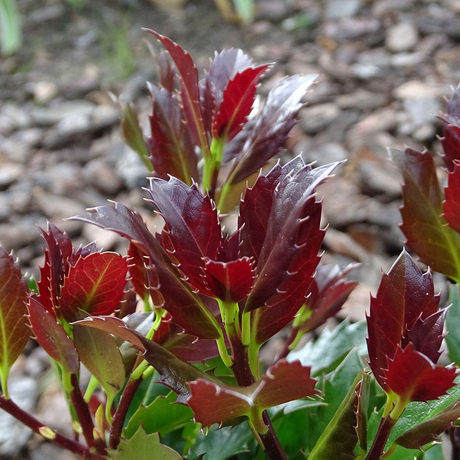 A Ilex x meserveae variety, commonly called blue holly or Meserve holly, Castle Rouge is the biggest thing to happen to blue holly since Kathleen Meserve made the first crosses of I. aquifolium and I. rugosa back in the 1950s to create a holly that could withstand harsh winters. This unusually colorful male species will pollinate 3 to 5 berry-bearing females within 50 feet but will not bear fruit itself. The shrub has an upright, erect, and narrow habit and a moderate growth rate. It makes a gorgeous specimen in beds and borders but is shown to best effect when grouped or massed in foundation plantings, screens, and hedges.