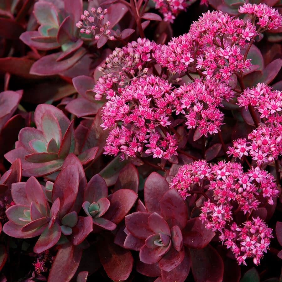 This dazzling emerald-and-ruby stonecrop boasts a compact, upright habit, glossy jade foliage, and hot pink, butterfly-attracting flowers held on ruby red stems. Remarkable for its ability to hold its color all summer, and, of course, the drought tolerance that sedums are known for. Thrives in average or even poor soil.
