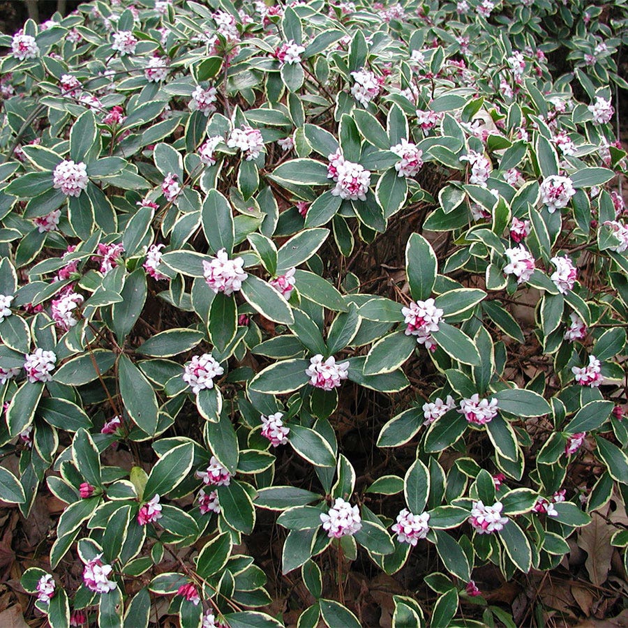 This Variegated Daphne 'Aureomarginata Rosea' is by far the most aromatic of all the daphnes. Opening its purple buds to pink-to-white blooms in early spring, it perfumes the entire garden, then remains attractive all year, with dark green foliage neatly outlined in brightest gold.