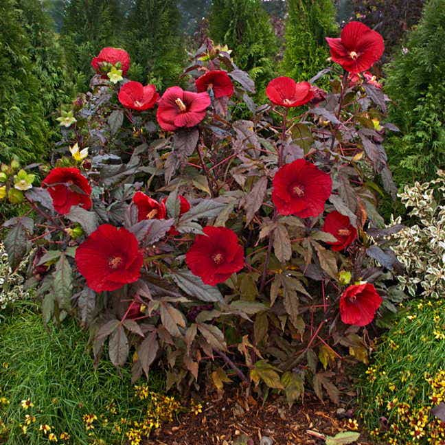 The handsome, maple-shaped leaves on this fast-growing rose mallow reach nearly a foot long, and are very abundantly borne on this well-branched, imposing perennial. Absolutely show-stopping, they make Hibiscus 'Midnight Marvel' an excellent choice for a specimen as well as a hedge, accent planting, or border standout. And the color refuses to green out in summer, even in fiery heat.