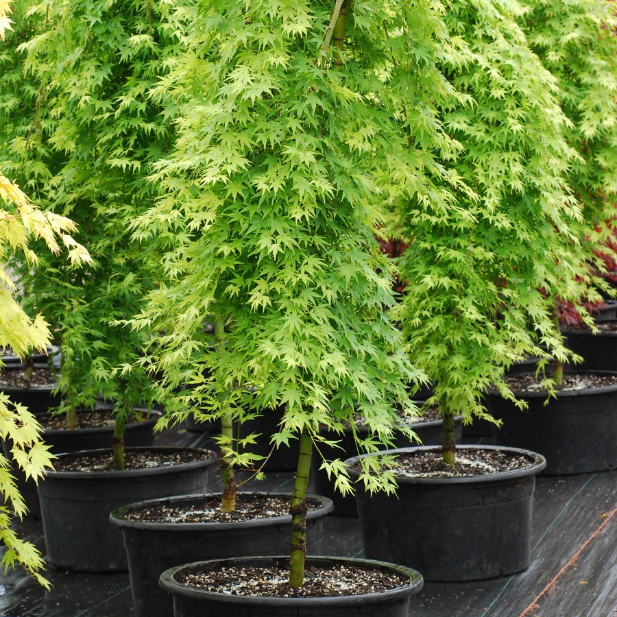 At last, a true weeping Japanese Maple! 'Ryusen' boasts a magnificent weeping habit with strong, pendulous branches bearing palmately divided leaves of bright green. It's a whole new look for the family!