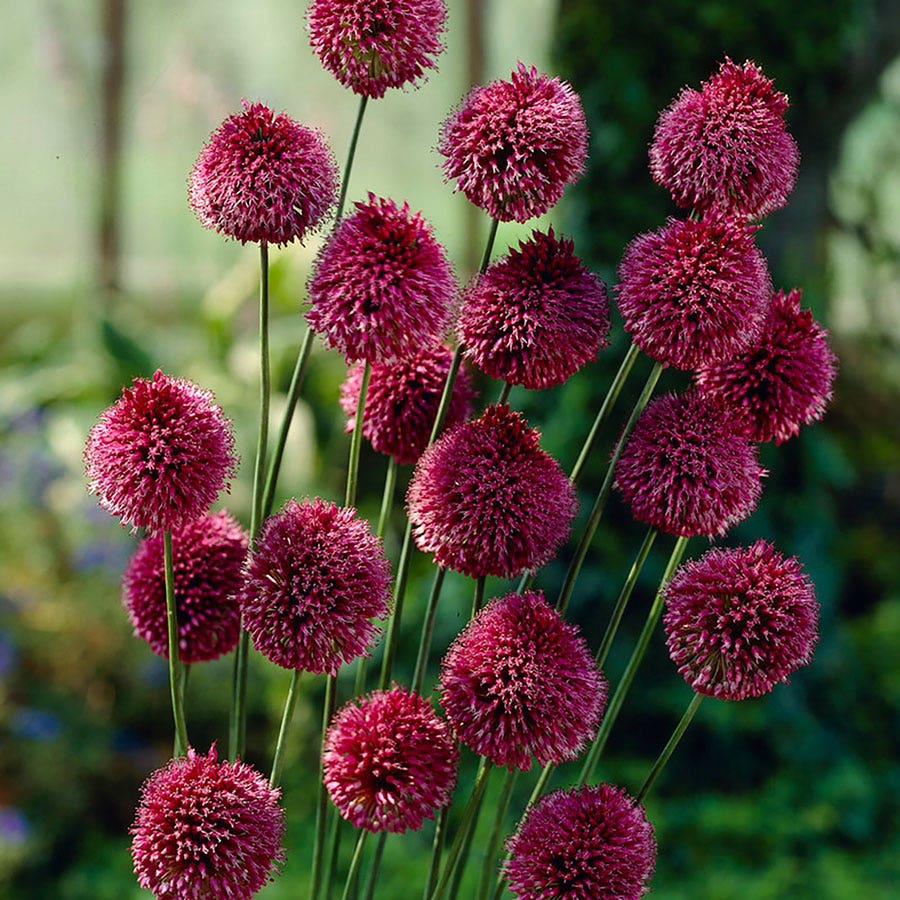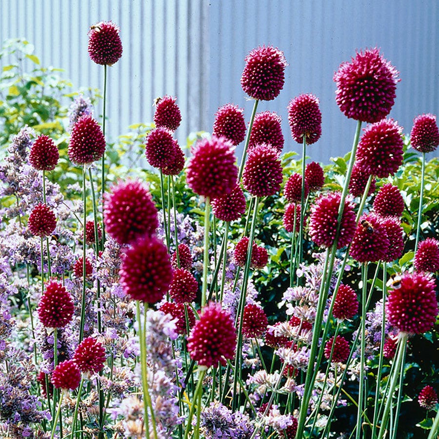 Plant Allium Drumbstick bulbs in fall, and in late spring to early summer, they bloom in large, egg-shaped flower heads dense with tiny rose-purple florets. Borne on tall, elegant stems, the stunning, long-lasting blooms have a mild fragrance and a stylish, modern appeal in the garden. They make chic floral displays, fresh and dried. Butterflies and bees adore them, but deer typically ignore them.