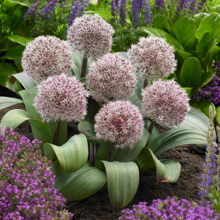 - Description / Allium karataviense Bulbs- Royal Horticultural Society Award of Garden Merit - Pack of 7 Bulbs - Plant Allium karataviense bulbs in fall, and in late spring to early summer, they bloom in large, round flower heads dense with tiny, starry, dusty pink to purple florets. A native to Karatau Mountains in Kazakhstan, commonly called Turkistan onion, this compact perennial has beautiful broad gray-green leaves that have a slightly red edge and are sometimes mottled with purple. The stunning, long-lasting blooms have a mild fragrance and a stylish, modern appeal in the garden. They make chic floral displays, fresh and dried. Butterflies and bees adore them, but deer ignore them. - Allium karataviense bulbs are often grown as annuals, but grown in appropriate Zones, the bulbs multiply every year and are great for naturalizing. Bulbs are so easy to grow, they're virtually foolproof. Cold hardy, Allium karataviense grow almost anywhere but perform best in sunny to partially shady locations with fertile, well-draining soil, and are shown to best effect when grouped in mixed beds, borders, or containers. - Allium karataviense Bulbs Includes: - Allium karataviernse: 7 bulbs - Total bulbs: 7 - Note: Height, bloom time, and color may differ in various climates