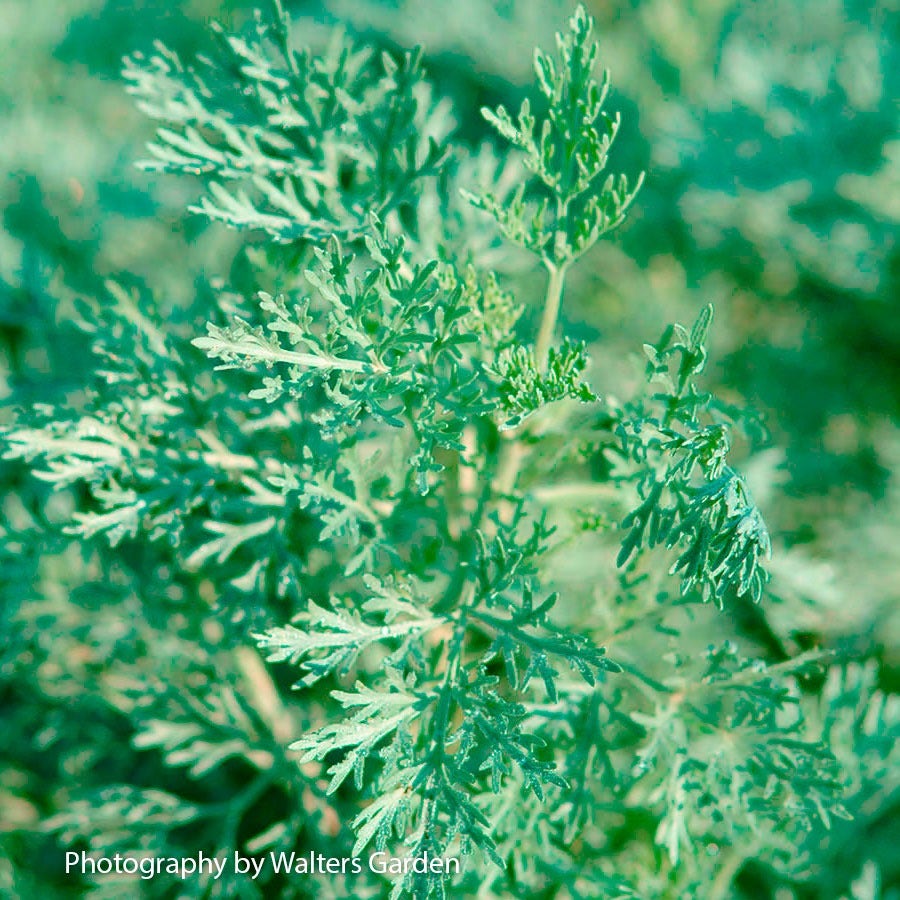Artemisia 'Powis Castle' Wormwood is a shrublike herbaceous (evergreen in warm climates) perennial grown for its fragrant feathery foliage. This award-winning plant has fernlike silvery white leaves that add soft texture and color to the garden. It grows in an upright, bushy mound that spreads by rhizomes and blooms (rarely) in inconspicuous yellow flowers in late summer or early fall, which are usually cut off to keep the foliage looking its best.