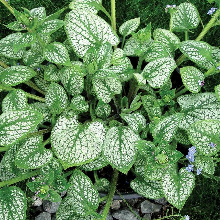 This Heartleaf Brunnera begins spring with fresh leaves of olive green overlaid with a bright silvery tracery, intricate and very beautiful. Many-layered and dense, the Brunnera 'Sea Heart' perennial has a much larger impact than you would expect from its size, thanks to the detailing on every leaf.