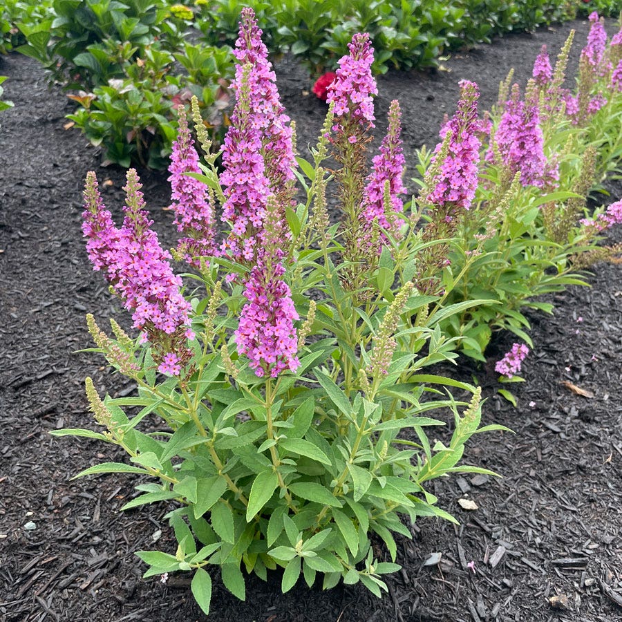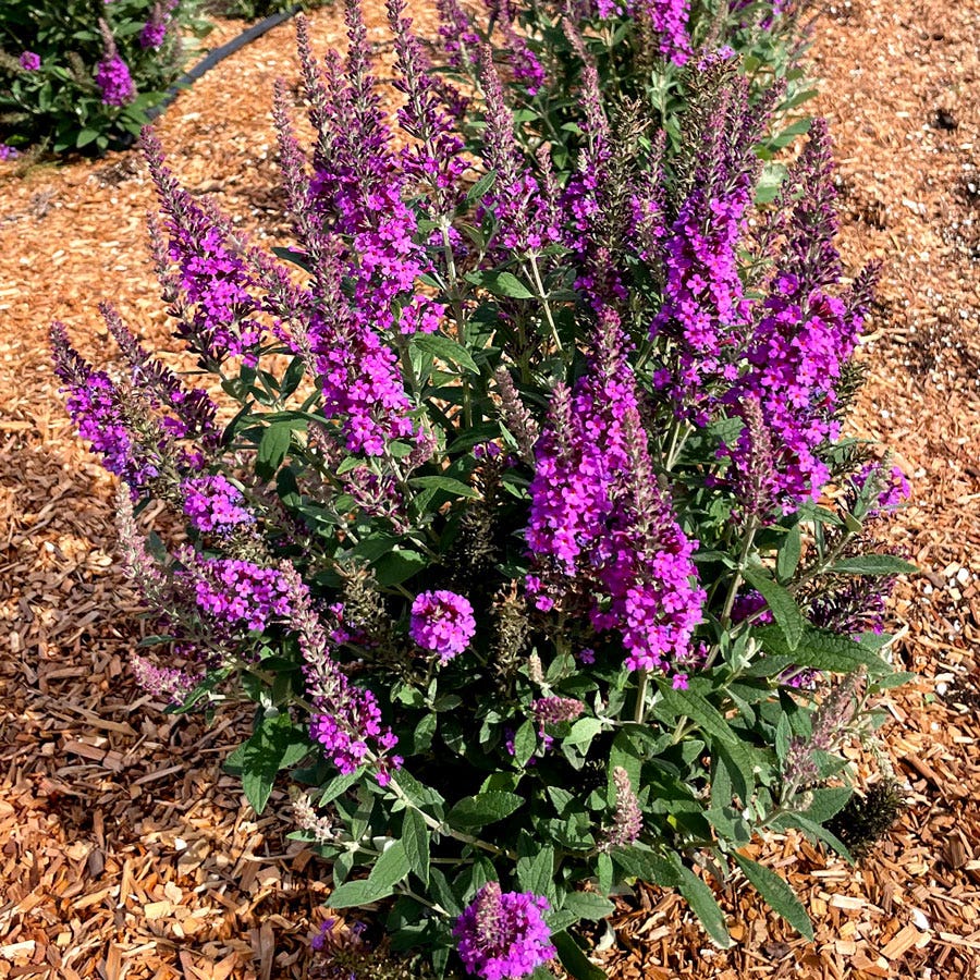 A Bloomin' Easy® variety, Buddleia Birthday Cake™ is a flowering deciduous shrub offering 3 seasons of interest, blooming and reblooming summer and fall, possibly to first frost. The large flower spikes, dense with purple blooms, are borne on long stems that stand erect, well above the foliage, reminiscent of candles on a birthday cake (hence the name). The nectar-rich flowers are mildly but sweetly fragrant and extremely pollinator friendly, attracting tons of bees, butterflies, and hummingbirds.