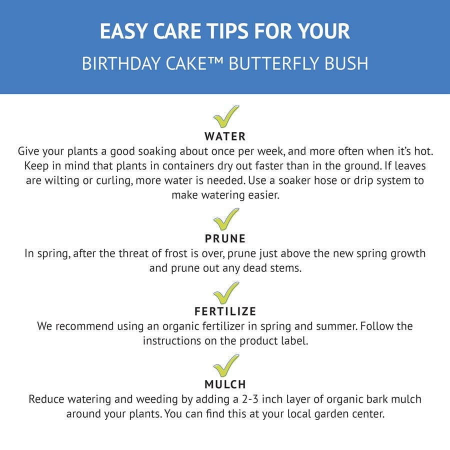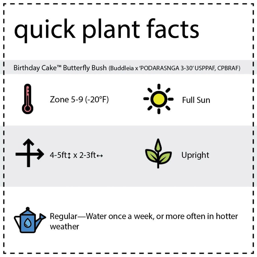 An easy-grow, easy-care shrub, Buddleia Birthday Cake performs best in sunny locations with average, medium moist, well-draining soil. The plant is heat tolerant, deer-resistant, and pet friendly. Deadheading regularly encourages and prolongs flowering and discourages any unwanted self-seeding.