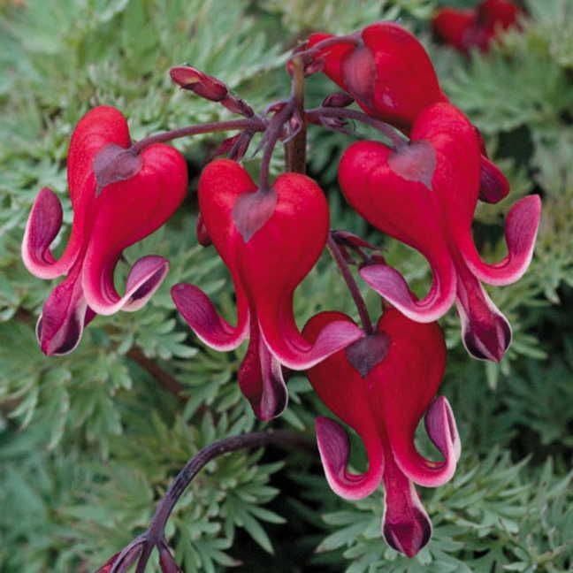 The flowers have a lovely locket shape and two bright colors: rich rosy red surrounded by a clean white edge. They appear above deeply divided glaucous blue-gray foliage with a ferny look on compact, nicely mounded plants in shade to partial sun. Be sure to give Burning Hearts plenty of water and enriched soil. Keeping the plant well hydrated is the key to its long bloomtime. When stressed for water, it will begin its dormancy period.