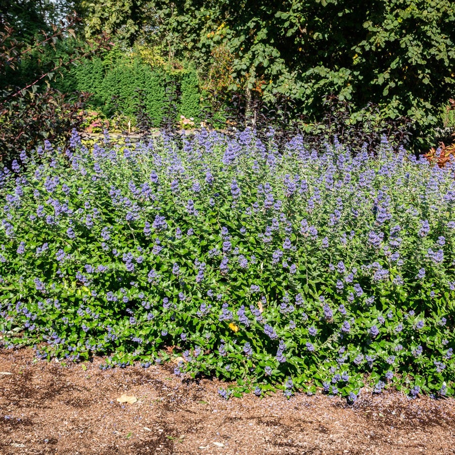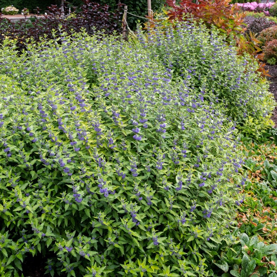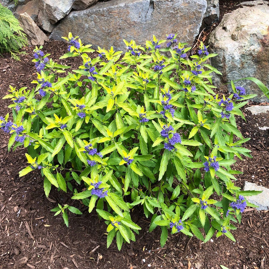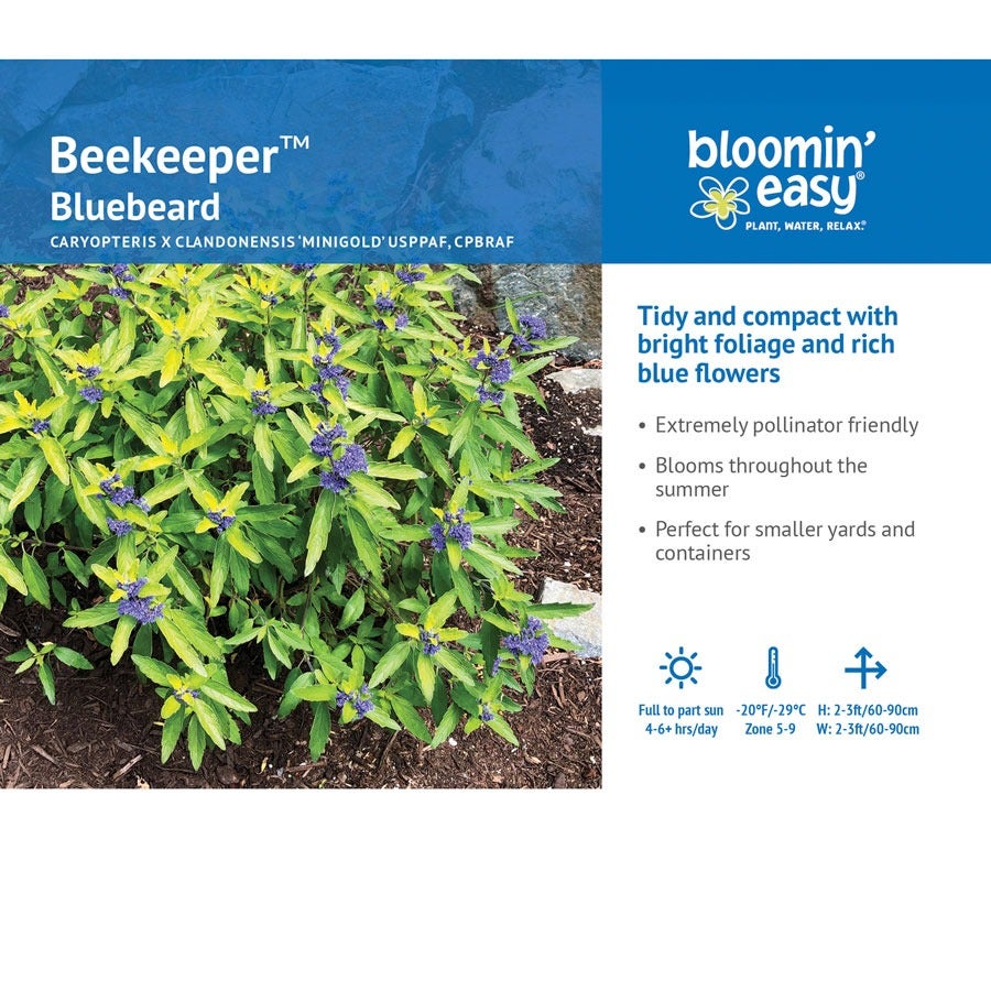 A Bloomin' Easy® variety, Caryopteris Beekeeper™ was bred with busy young homeowners and their modern-sized outdoor spaces in mind, fitting into small spaces nicely and having an easy-care attitude, requiring little maintenance. An improved variety of Caryopteris (commonly called bluebeard), Beekeeper is even more beautiful and easy going than most. This finely textured deciduous shrub has a diminutive, well-kept form, staying between 2 and 3 feet tall and wide. It's attractive even before it blooms; but summer through fall, bright cornflower blue flower clusters simply "pop" against its vibrant chartreuse foliage. And you know with a name like Beekeeper, this bluebeard is bee haunted, but it actually calls to all pollinatorS, including butterflies and hummingbirds. Leaves turn slightly greener in summer and stay healthy looking, neither burning nor spotting.