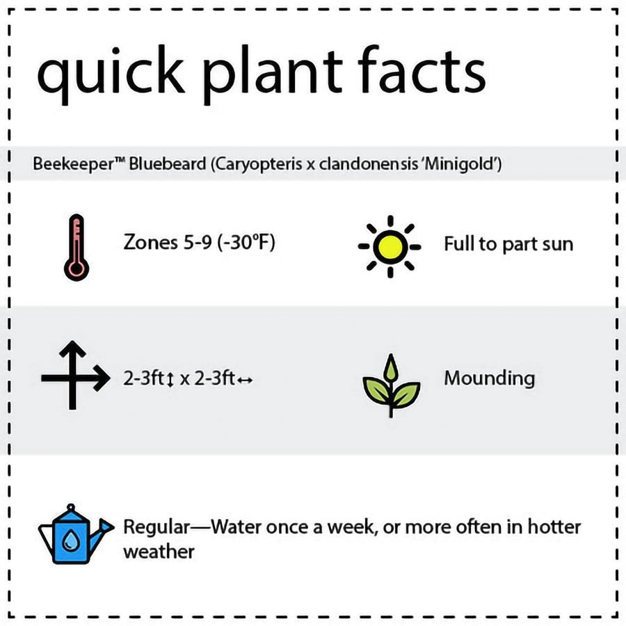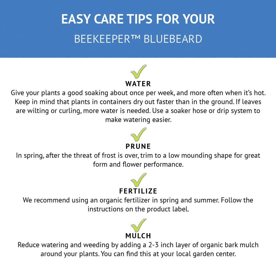 Plant bluebeards in locations with 4 to 6 hours of full sun a day and in soil with good drainage. Beekeeper thrives in Zones 5-9, tolerating cold temperatures down to -20°F (-29°C) and the heat. But in hotter weather, keep the plant well-watered, more than its typical once a week watering. Beekeeper is also a pet friendly plant.