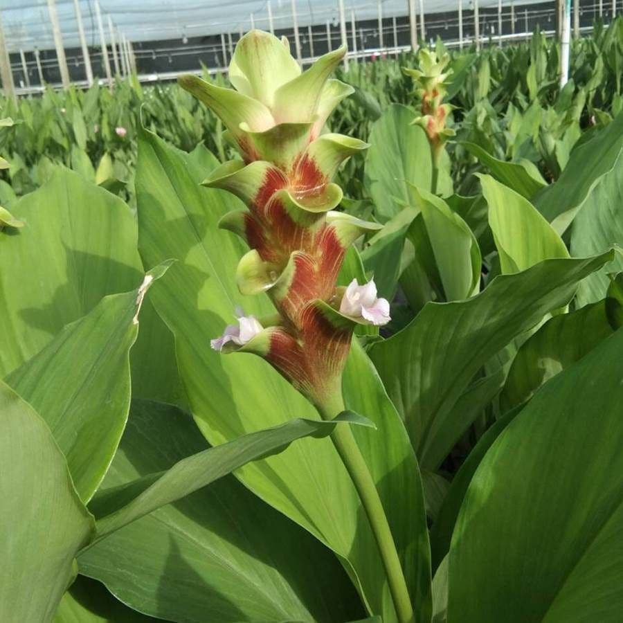 Curcuma 'Emerald Green' is a deciduous perennial offering summer interest. An elegant, long-blooming beauty, the plant flowers abundantly in showy spires of petal-like green to burgundy bracts surrounding small pale pink true flowers and repeat blooms throughout summer. Borne singly, each flower sits atop a rigid stem that makes an excellent cut flower.