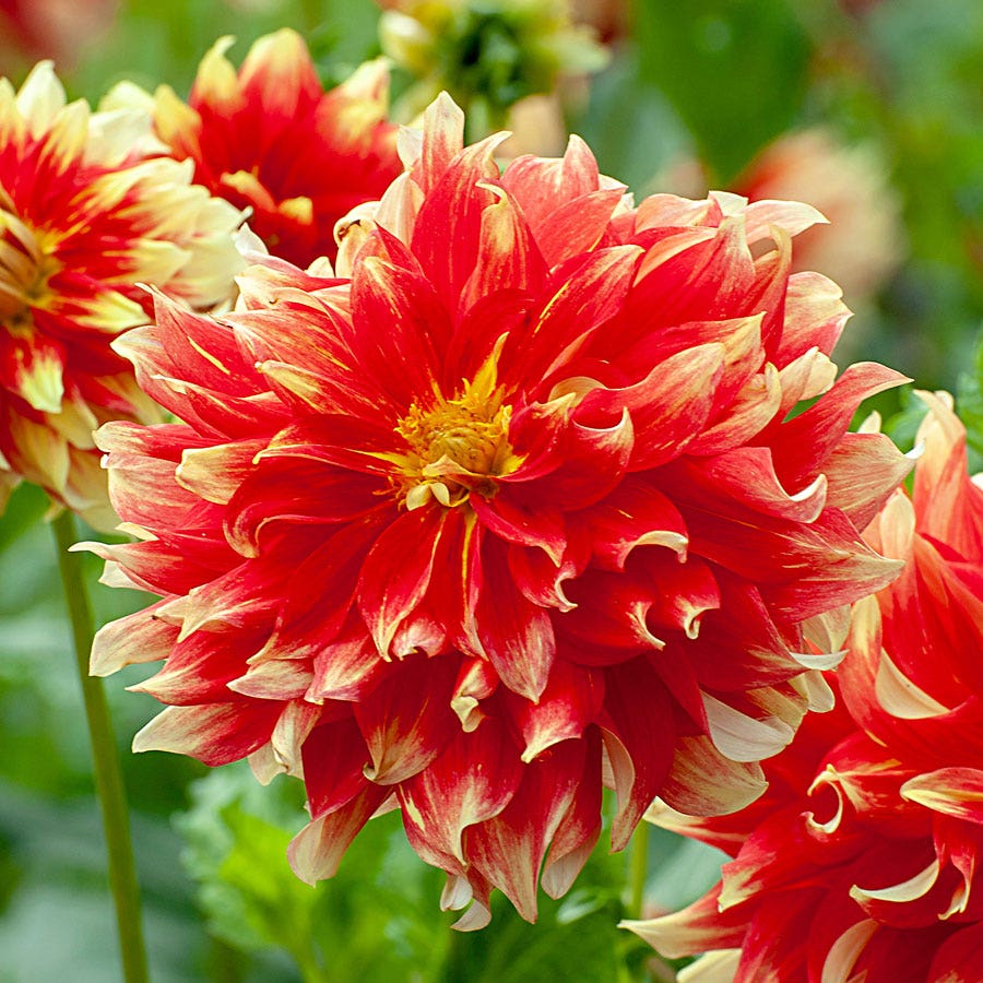 Immerse yourself in the radiant beauty of Dahlia 'Holland Festival' a vibrant spectacle that transforms your garden into a mesmerizing canvas of color! As the last vestiges of frost yield to the gentle caress of spring, it's time to welcome this breathtaking decorative dahlia into your botanical haven. From the sun-kissed days of midsummer to the golden hues of autumn's arrival, 'Holland Festival' unfurls its majestic 8-inch double blooms, each a symphony of vibrant red-orange petals that gracefully fade to yellow at the tips. Supported by tall, sturdy stems that stand resolute against rain and wind, these nectar-rich blooms beckon bees, butterflies, and hummingbirds, infusing your garden with vibrant life for months on end.