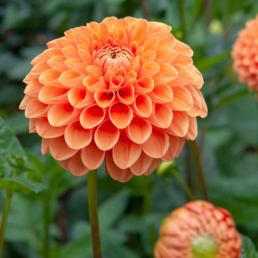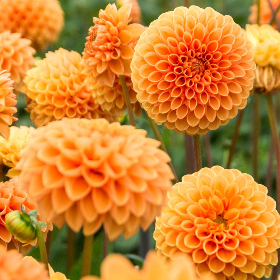 Plant 'Sylvia' Pompon Dahlias with anticipation as early spring arrives, signaling the end of frosty days. As the seasons unfold, from midsummer's warmth to the crispness of late fall, this exquisite pompon dahlia unfurls its splendor, adorning the garden with an abundance of blooms. Each flower, measuring approximately 4 inches in diameter, presents a captivating display of tightly rolled, cupped petals in a captivating array of orange tones, ranging from the soft blush of peach to the vibrant allure of coral. Standing tall on sturdy stems, resilient even amidst rain and wind, these orange flowers become a magnet for nature's pollinators, attracting bees, butterflies, and hummingbirds to dance among their nectar-rich bounty for months on end.