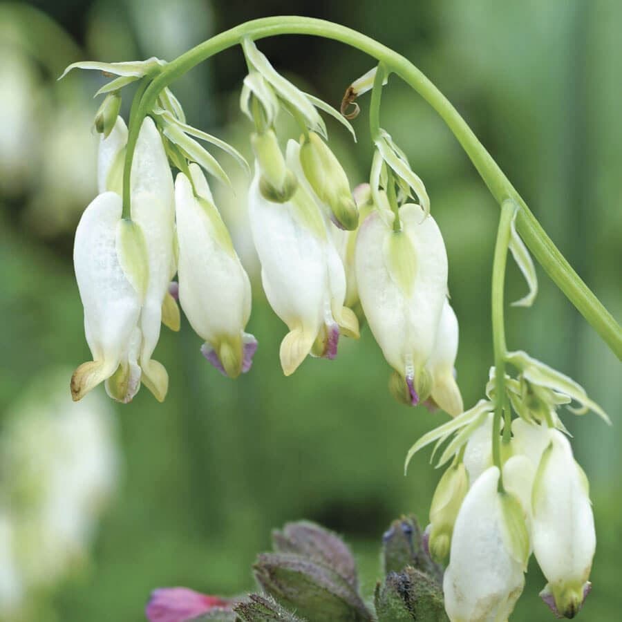 Long blooming, this bleeding heart produces sprays of weeping, heart-shaped blossoms from late spring to late summer. The white flowers blush pink and dangle gracefully on long, leafless stems above the deeply cut, fern-like, grey-green foliage.